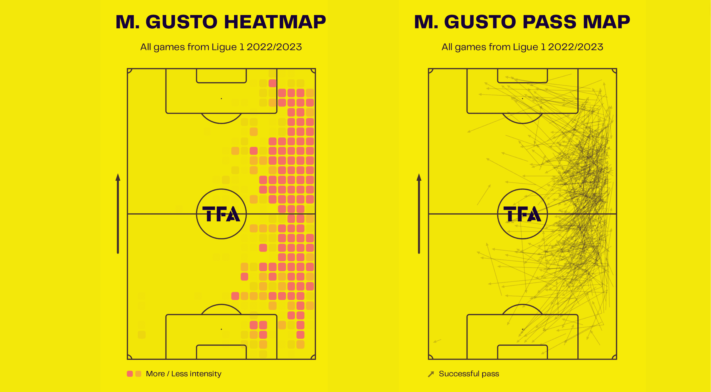 However, he has also impressed in the defensive phase of the game. At the time of writing, Gusto is in the 95th percentile for defensive duels per 90, but only the 50th percentile for the percentage of defensive duels won and the 80th percentile for positioning (blocks and interceptions).