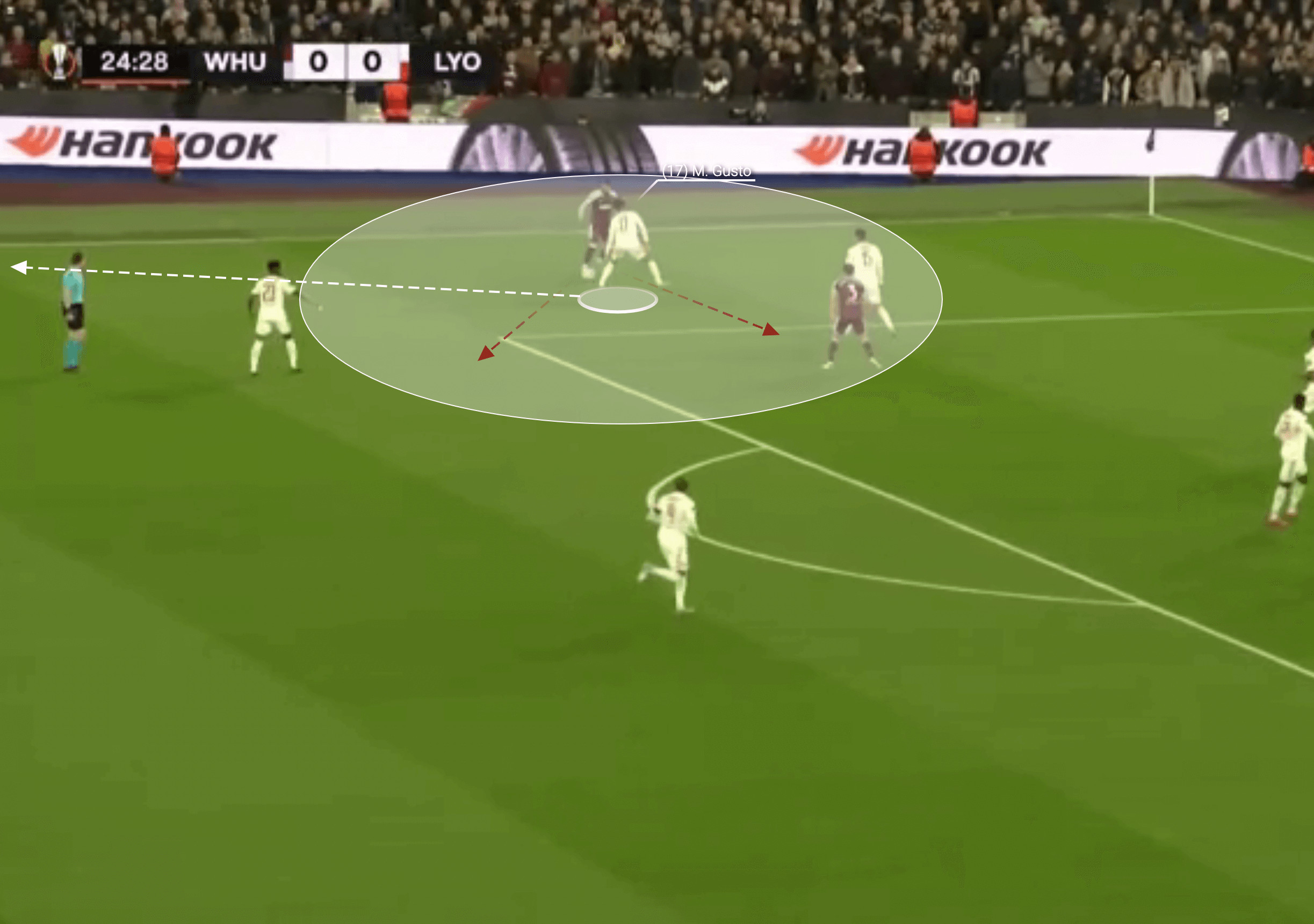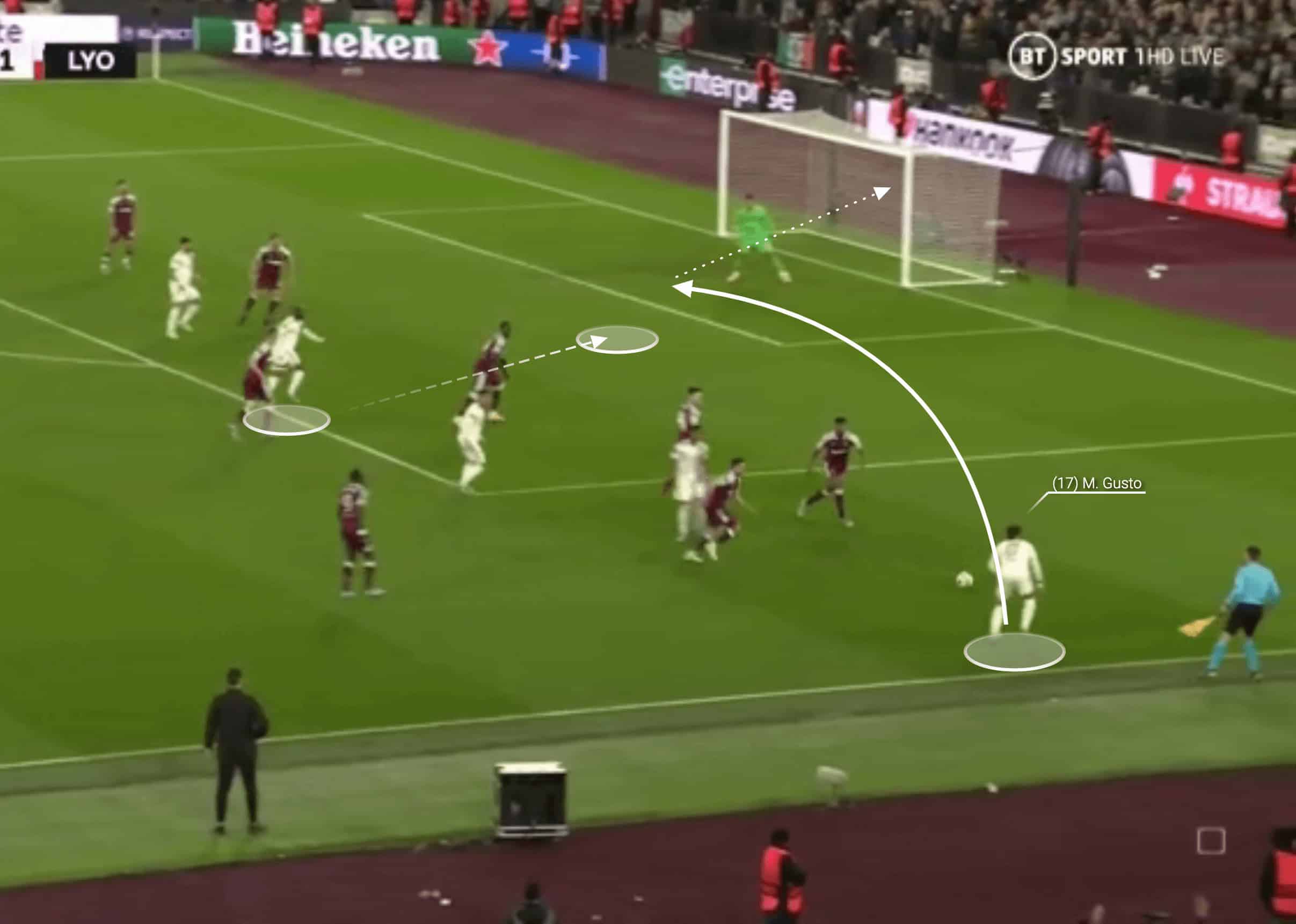 This time, we see Gusto defending in a more traditional 1v1 situation in the match between Lyon and West Ham in European competition.