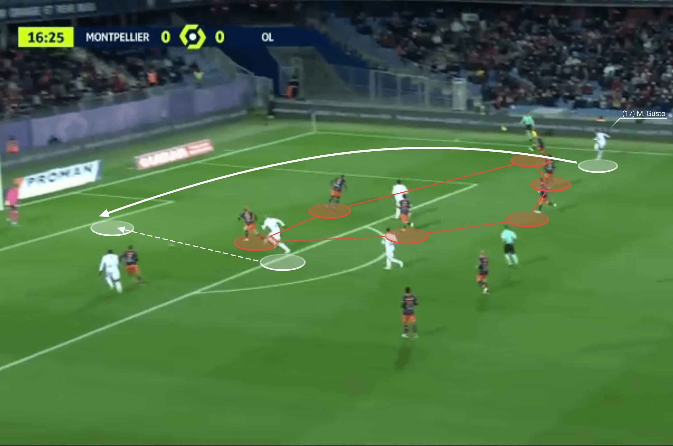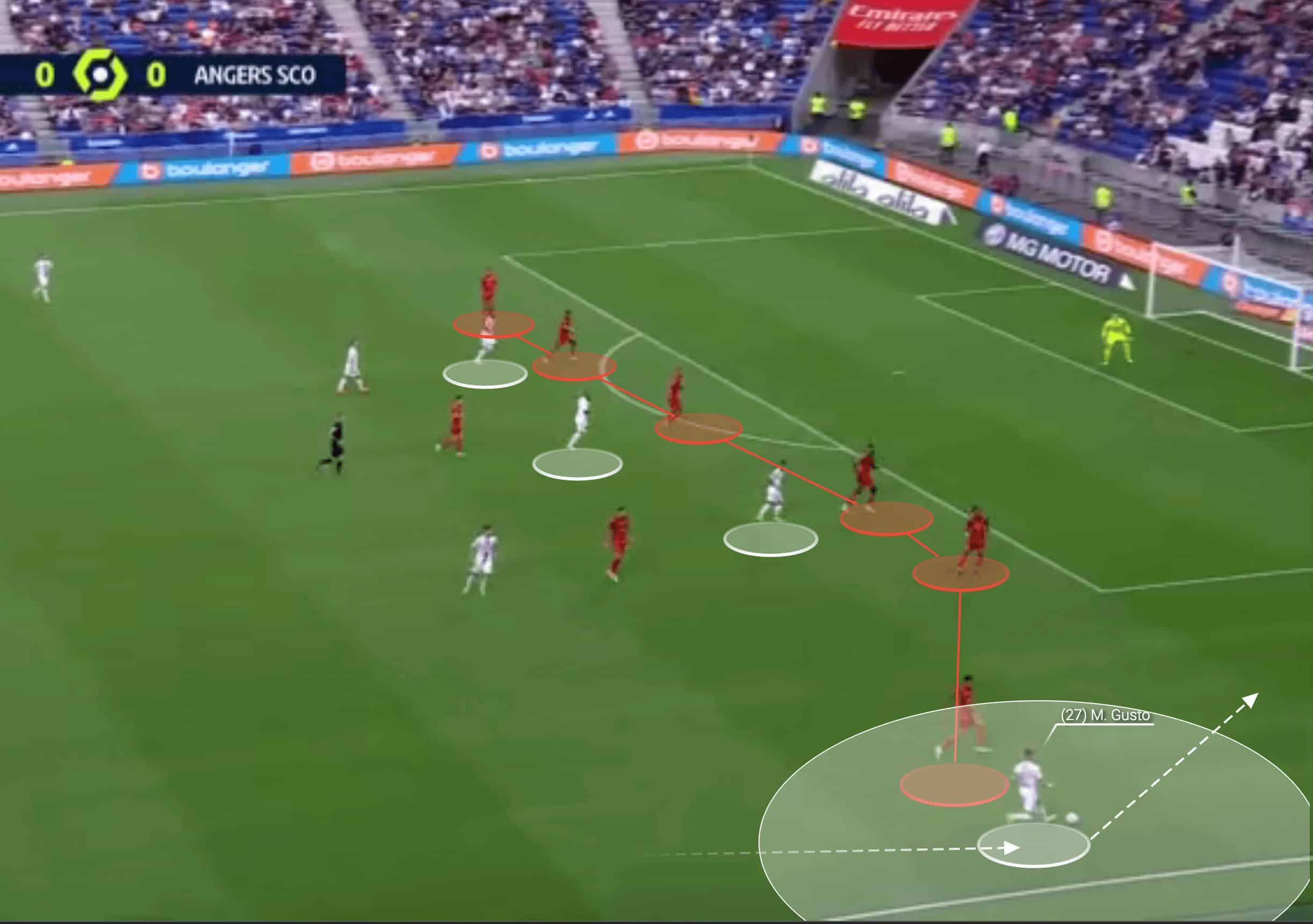 Here we see an example from the match between Lyon and Angers as Gusto again receives the ball tight to the touchline.