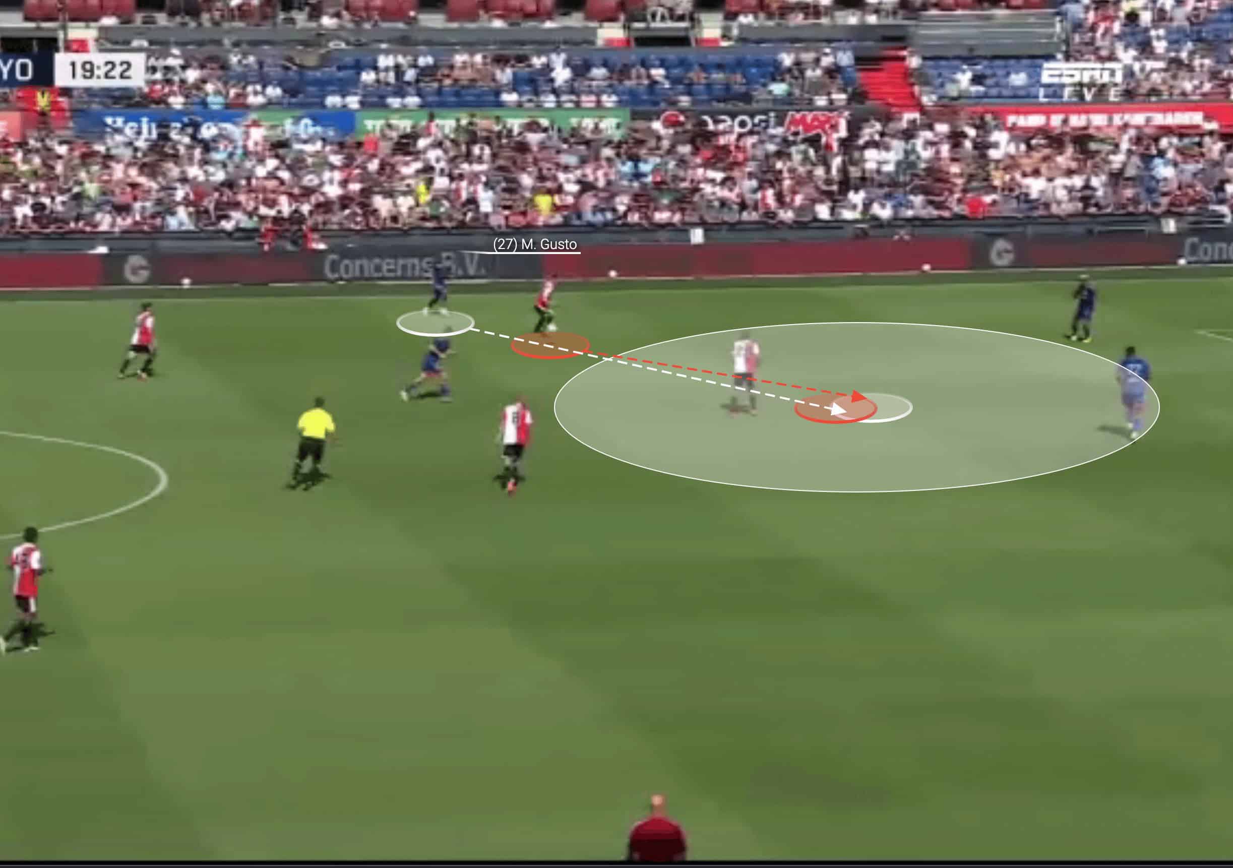 While it is true that Gusto very rarely takes much time when he receives the ball in the final third, he always wants to put the ball into dangerous areas; that does not mean that he cannot drive forward in possession of the ball to get the ball into those positions on his own.
