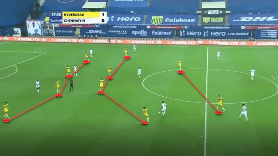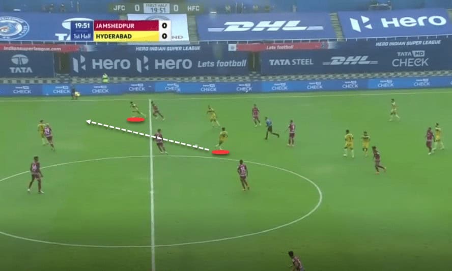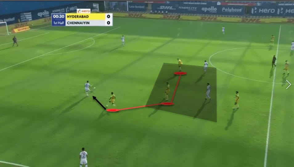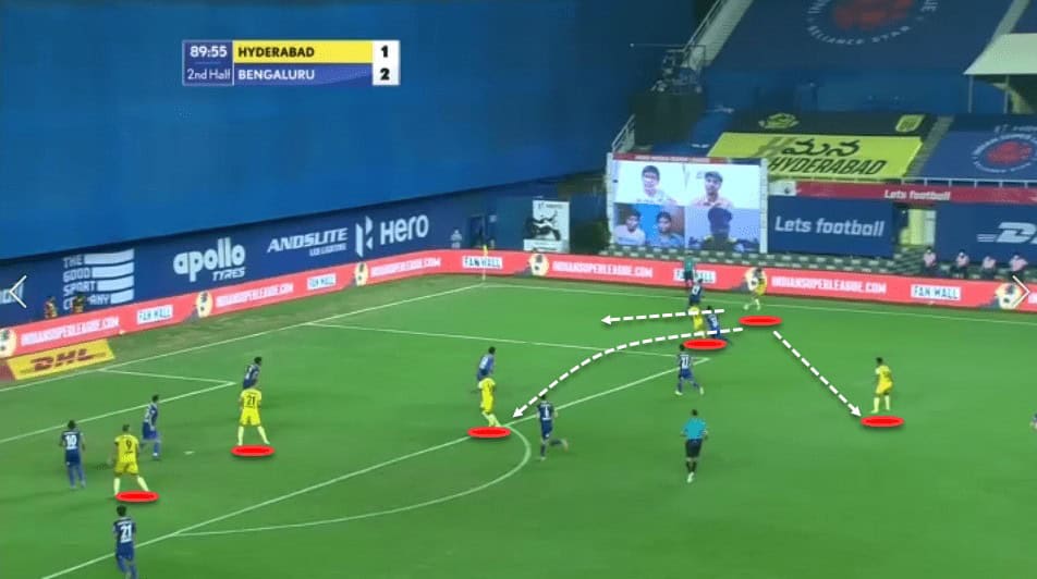 We can see that Hyderabad have multiple players giving the wide man options, which not only helps him, but also puts immense pressure on defenders as it is difficult to predict who the player would be passing to. Secondly, this organisation also helps them to win second balls and make recoveries quickly in the event of a turnover in possession.