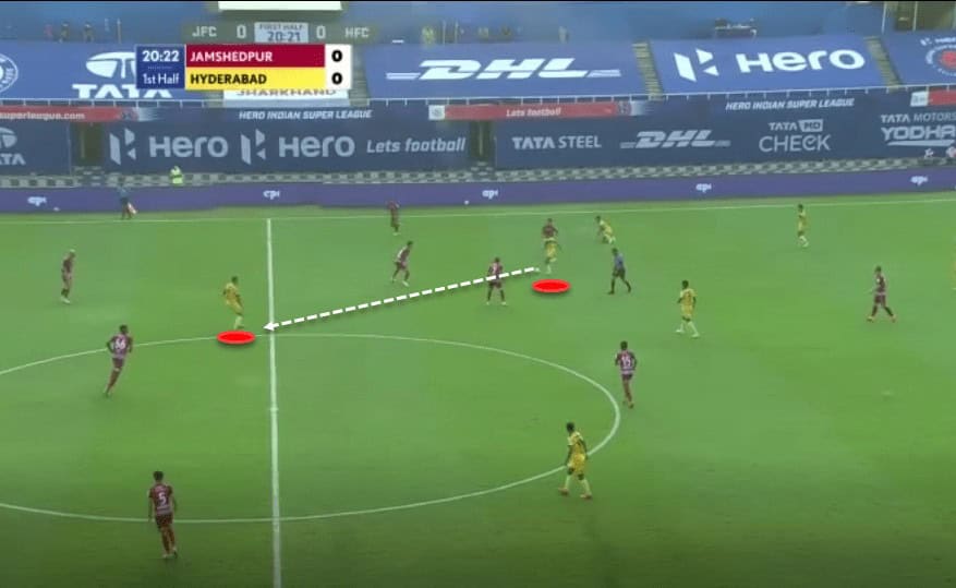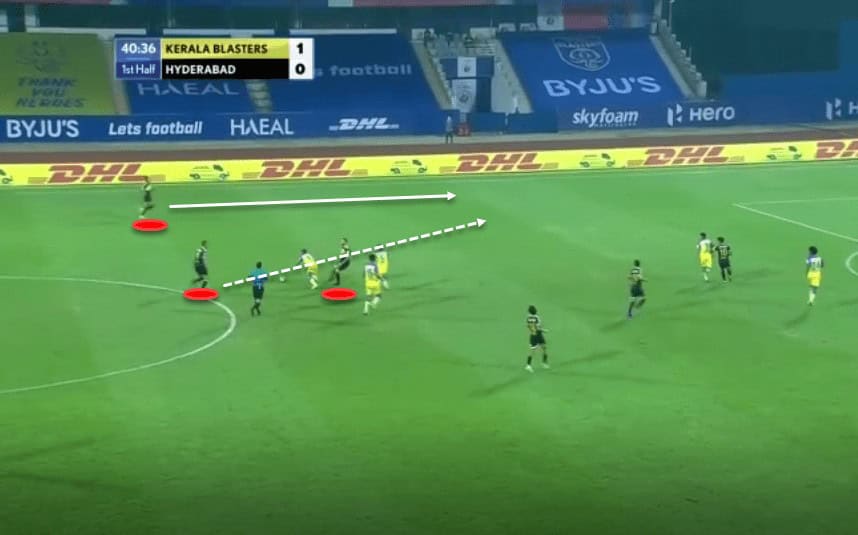 This image shows Hyderabad’s positioning when in the build-up phase. As stated earlier, the defensive midfielder drops in between the two centre-backs while the full-backs push up. If the player on the ball manages to find the pivot in the centre, then the ball is played through the centre and if not, he has passing options out wide to exploit the space.