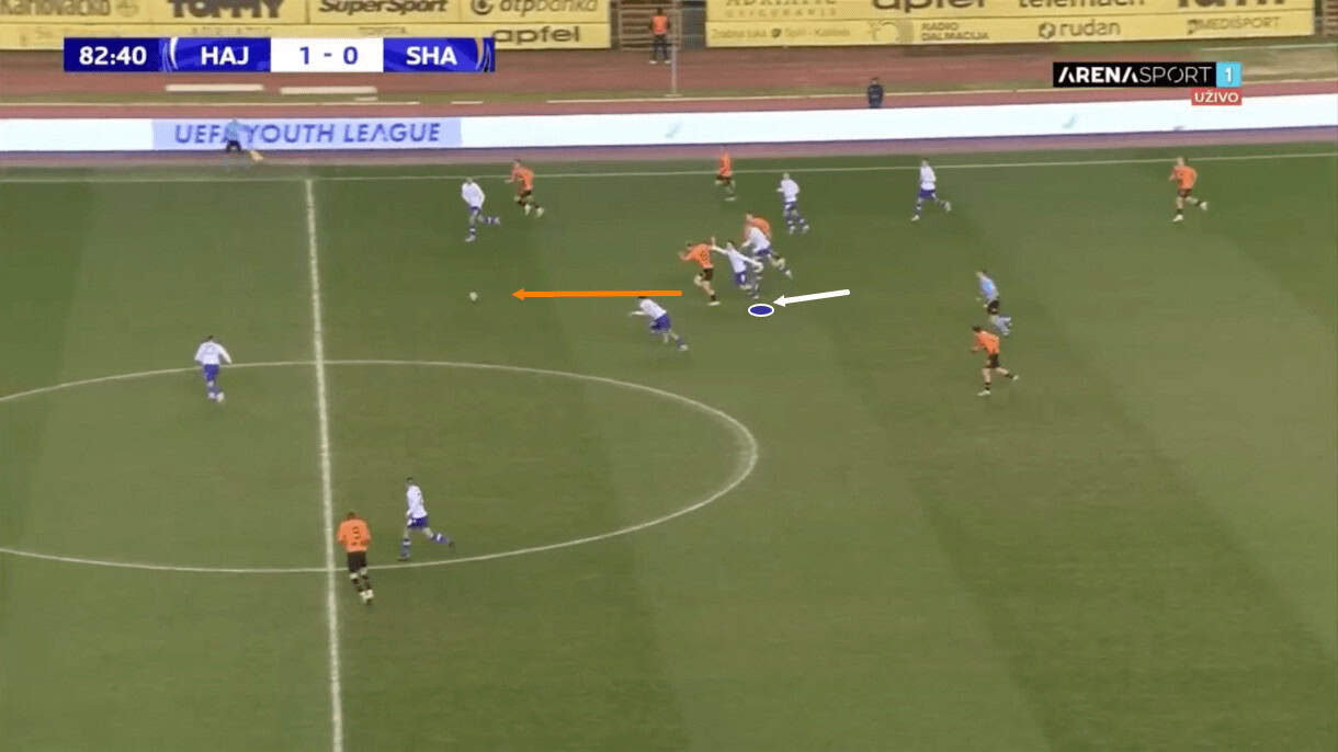 This pass is played and the right-back gets on the ball, but Hajduk’s centre-forward continues tracking back, not taking a second to hesitate or just give up as a result of the ball moving beyond his specific area of the pitch.