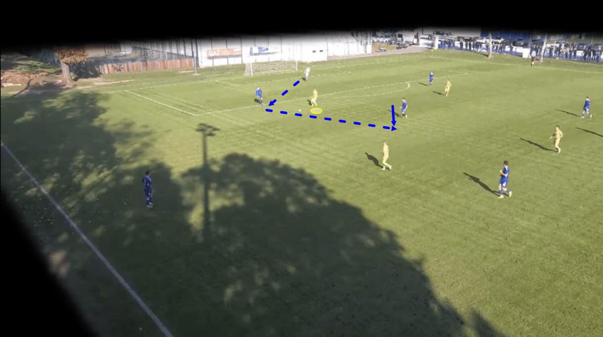 As play moves on into figure 6, we see that after the right centre-back does, in fact, receive the ball back again, he actually manages to find a pathway around the left centre-forward and into the holding midfielder’s feet.