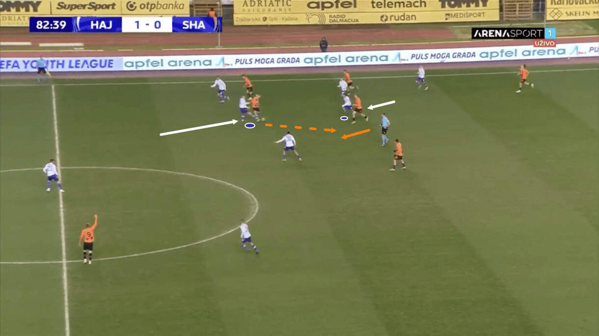 Again in this passage of play, we see an example of how Hajduk may try to force play into the wide areas, this time focusing on how the centre-forwards shadow the opposition’s holding midfielder, denying the central progression via that avenue while leaving the pass out to the wing open. Unfortunately, however, the opposition did very well to get beyond Hajduk’s first line of defence on this occasion.