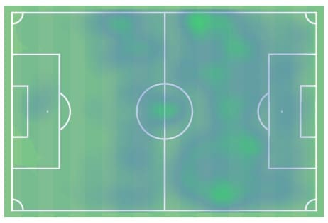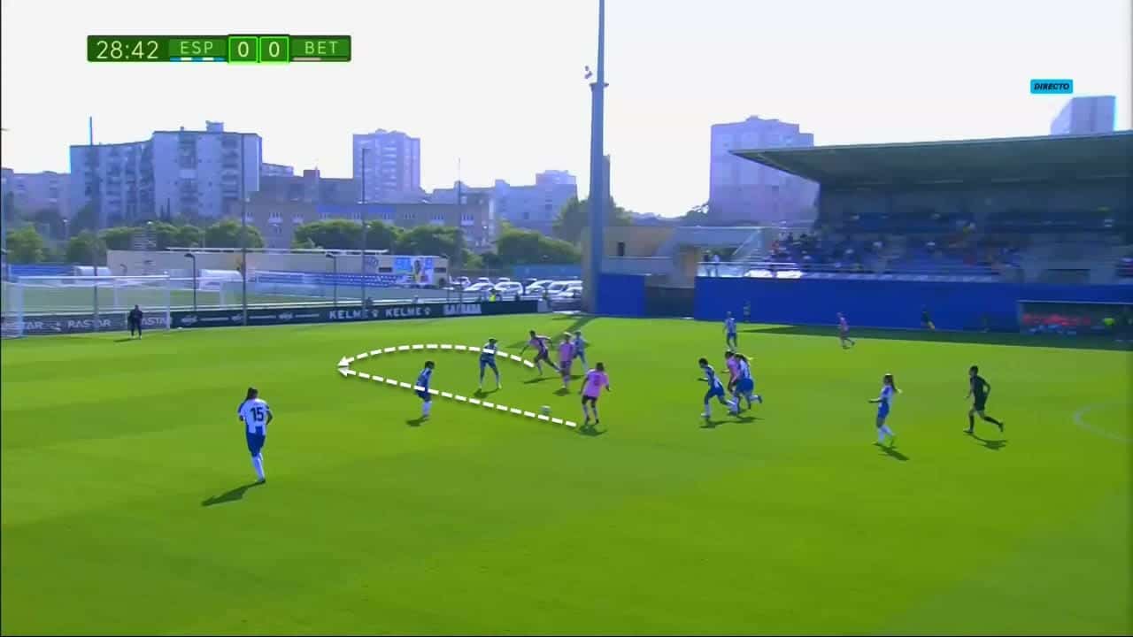 What characterises Piemonte and distinguishes her from a player like Giacinti is her passing skills, vision and most of all, her continuous backward movements especially on both wings, as you can see in the heatmap above, in order to act as a station. To succeed at that, Piemonte needs to be physically strong and has to master playing with her back towards the goal, and that’s what she is completely great at. When receiving the ball in such situations, she always makes sure to protect it very well with her body and rarely loses it. As you can see in this example, Piemonte covers the ball very well and always makes sure to scan the area that surrounds her to know if there is a marker planning to anticipate or intercept the ball. After scanning, she applies the “necessary measures” to keep her opponent away from the ball, by simply putting her back against the marker and helping with her hand to keep the distance between the player and the ball.