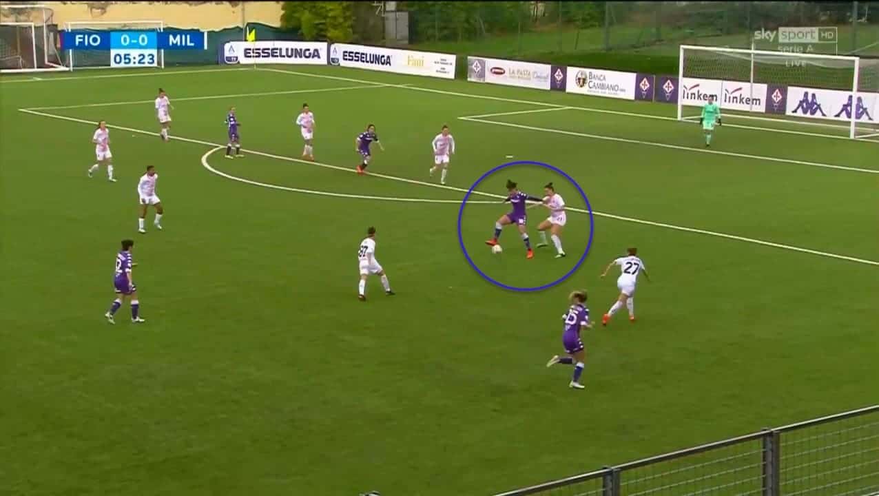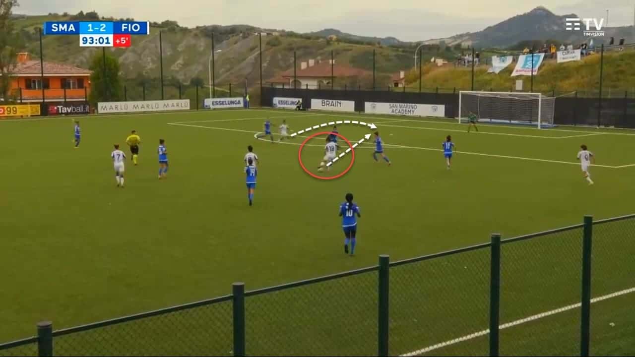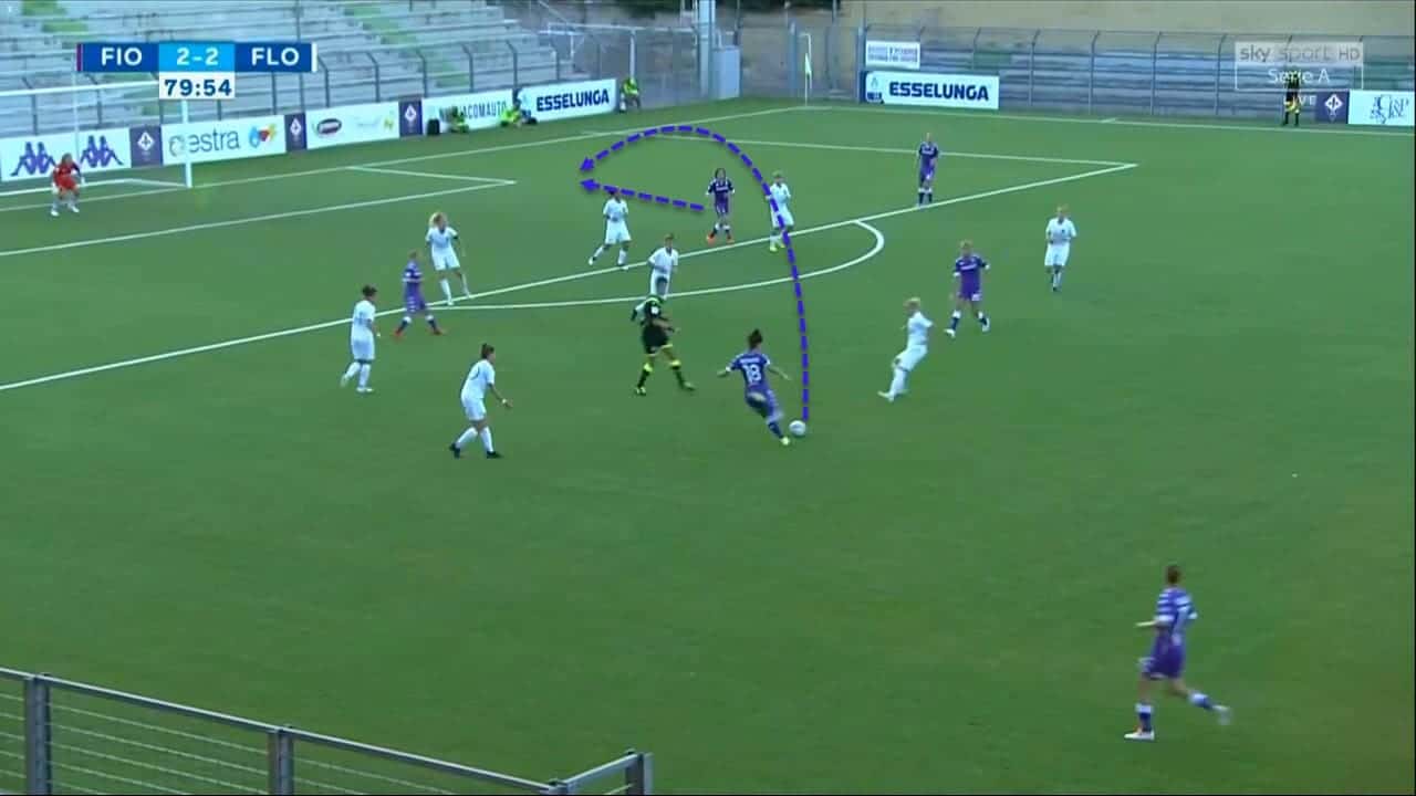 This characteristic can be exploited very well by the whole squad if they become aware of such strengths in their new striker. Moreover, Piemonte is often attentive to not fall in the offside trap and reads her teammates’ passes very well.