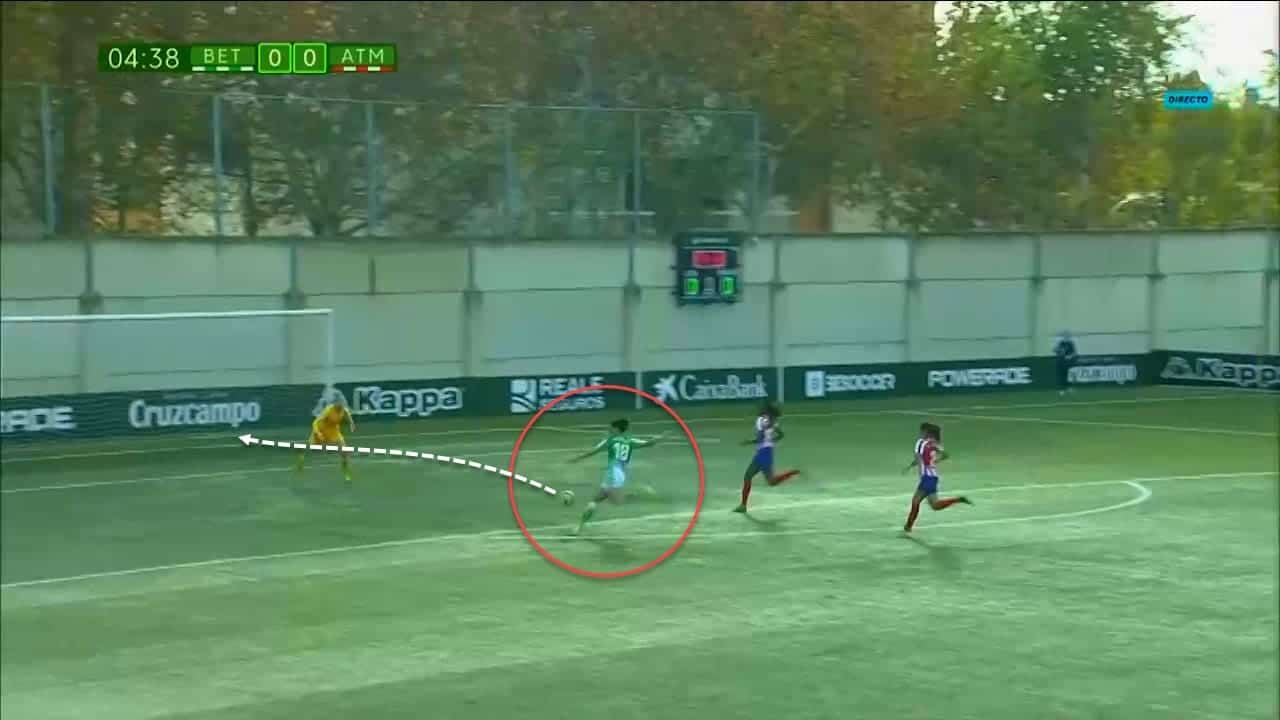 Piemonte proved several times that she can score goals using her left foot without problems as her left foot accuracy is relatively good for a striker despite being a right-footed player. You can see how she was able to score this goal against Atlético Madrid while shooting with power and precision.