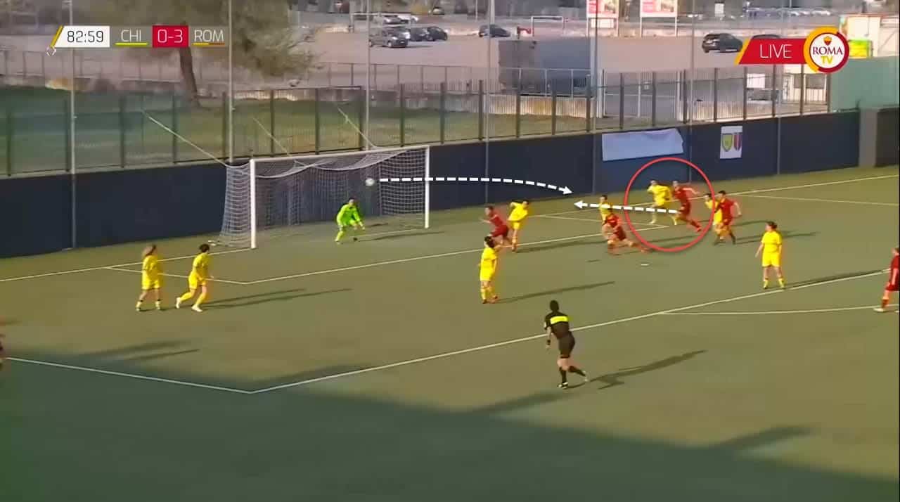 Not only in open play situations but also during set-pieces, Piemonte can be very effective and powerful since she is excellent in escaping from marking and exploiting her strength in beating anyone trying to stop her from reaching the ball. In addition, you can tell from watching her that Piemonte’s idol is Zlatan Ibrahimović, as she focuses a lot on winning such duels while being aggressive during such situations. In this example, it was clear how she remained far away from the middle of the penalty box on purpose in order to start running as soon as the free-kick is played. Given that she knows how complicated it is to stop her when she is running towards the goal, she exploits that aspect in her favour and uses this method frequently, as it proved fruitful on many occasions including this one.
