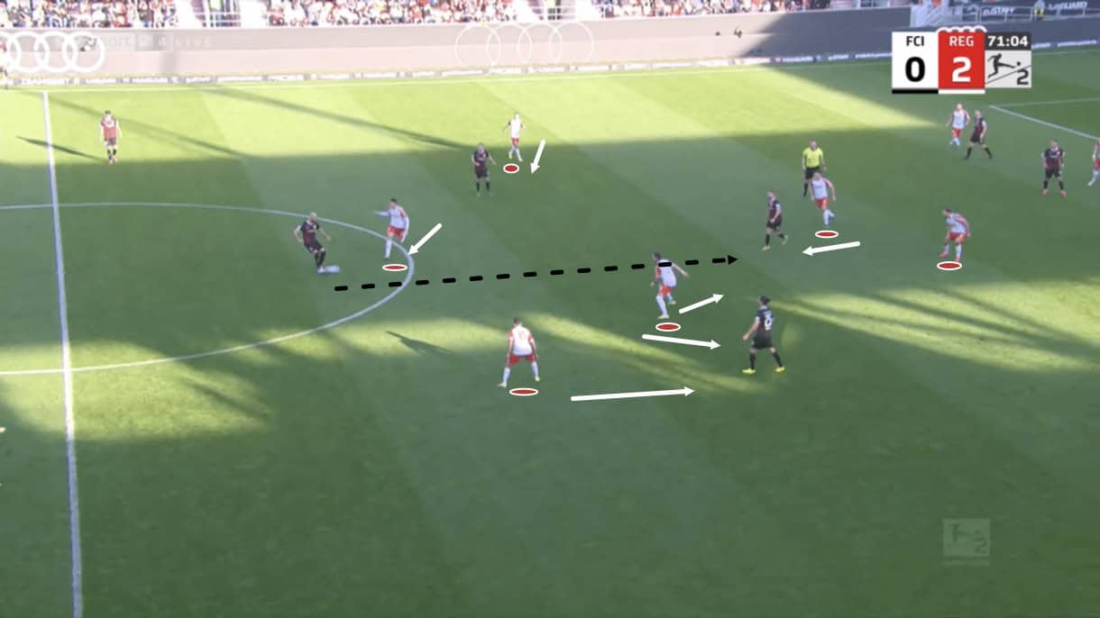 The centre-forward made a run off towards the centre from the right, dragging the opposition’s left centre-back away with him in the process, which created space between the left centre-back and left-back for Jahn Regensburg’s right-winger to target with his run, and the passer to target with his pass.