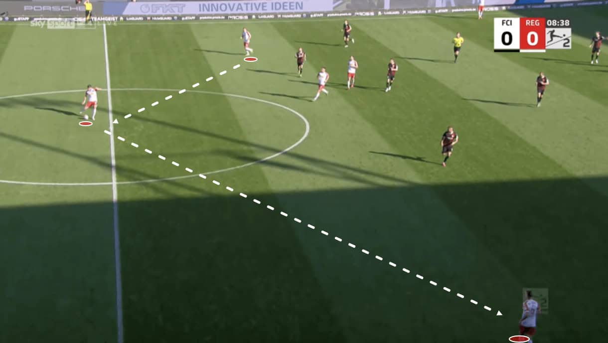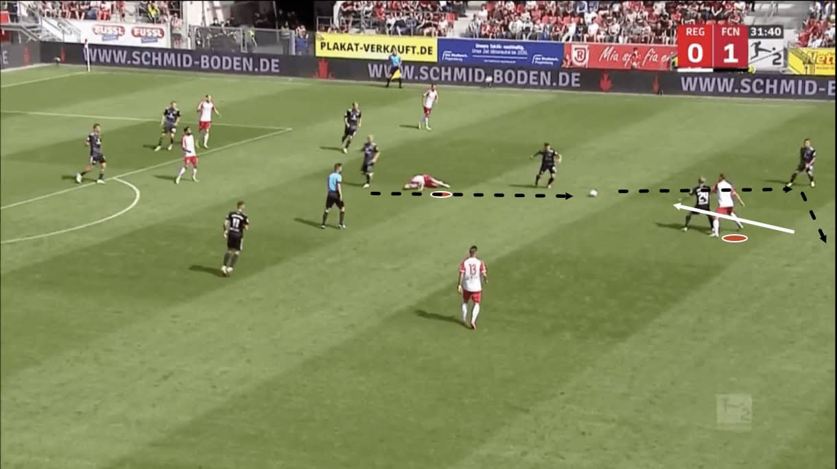 As play moves on from here, that’s exactly what happens and we see Jahn Regensburg’s right-winger played through on goal at the end of this quick but deadly little three-pass transitional move.