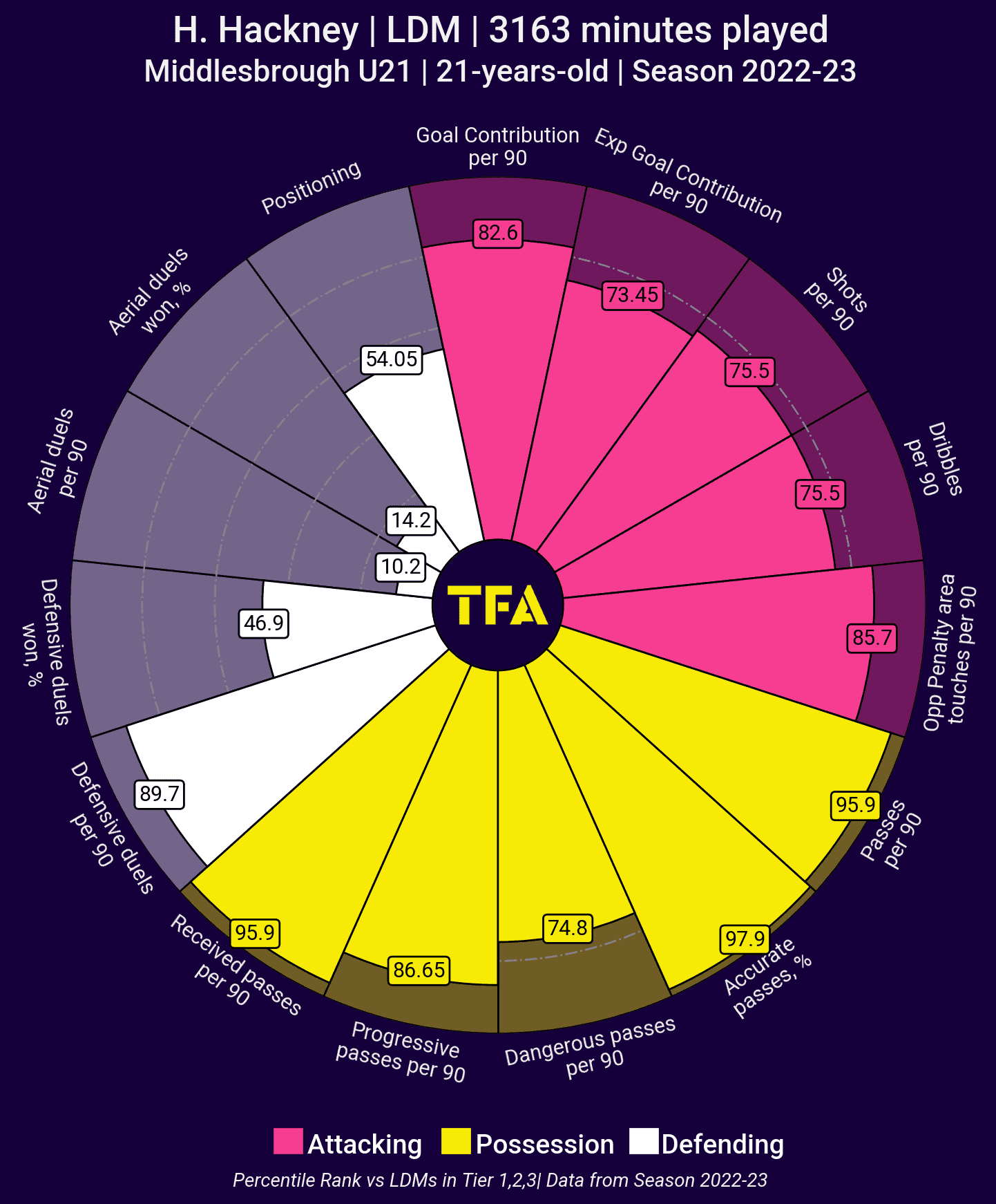 As shown in the chart, Hackney ranked in the 14.2nd percentile for percentage of aerial duels won compared to other left-sided defensive midfielders across the top three divisions last season.