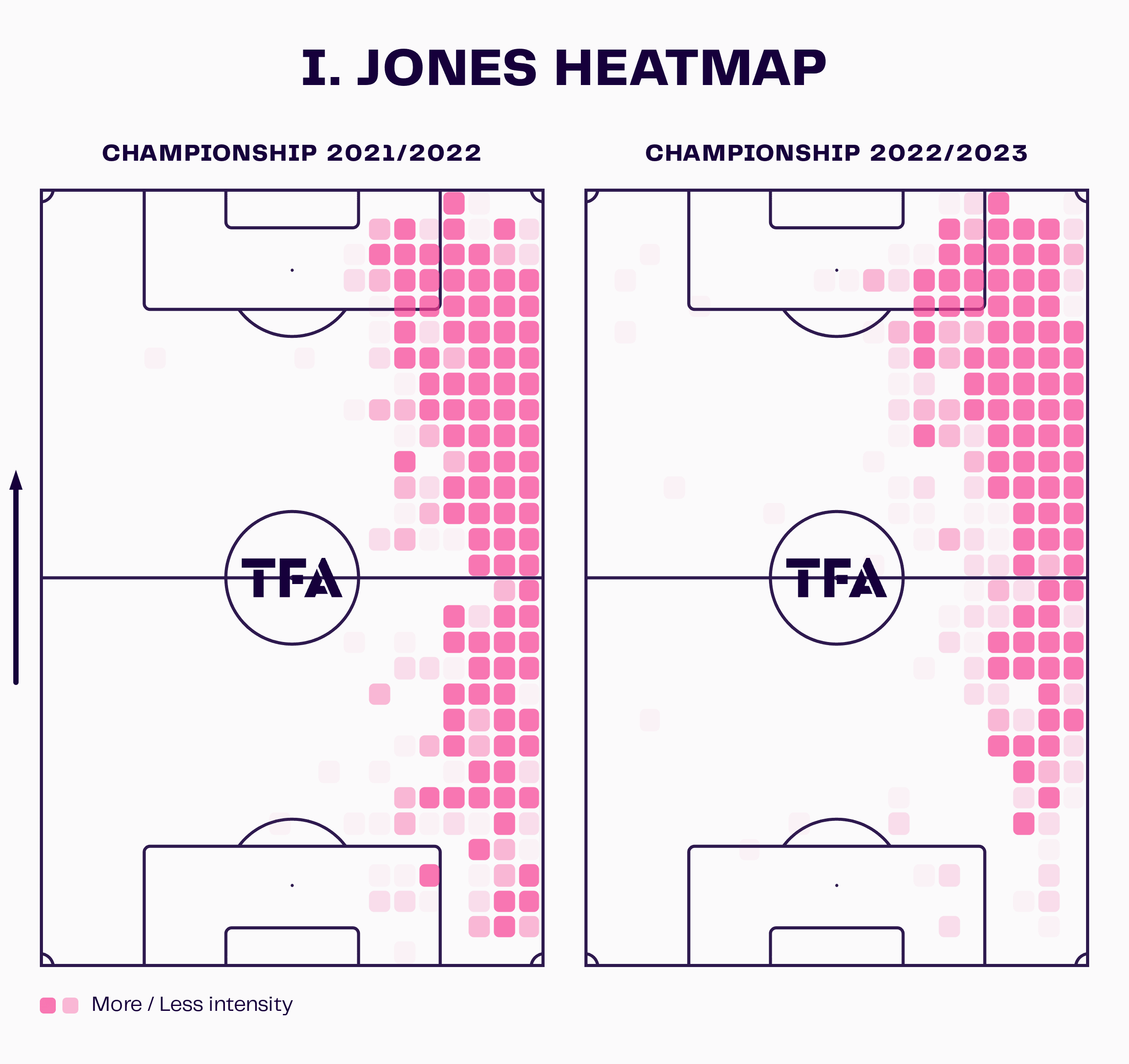 The heatmaps show Jones’s positional play down the right-hand side, and particularly in his debut season in 2021/22, he did not shirk his defensive duties as the graph testifies his ability to track back.