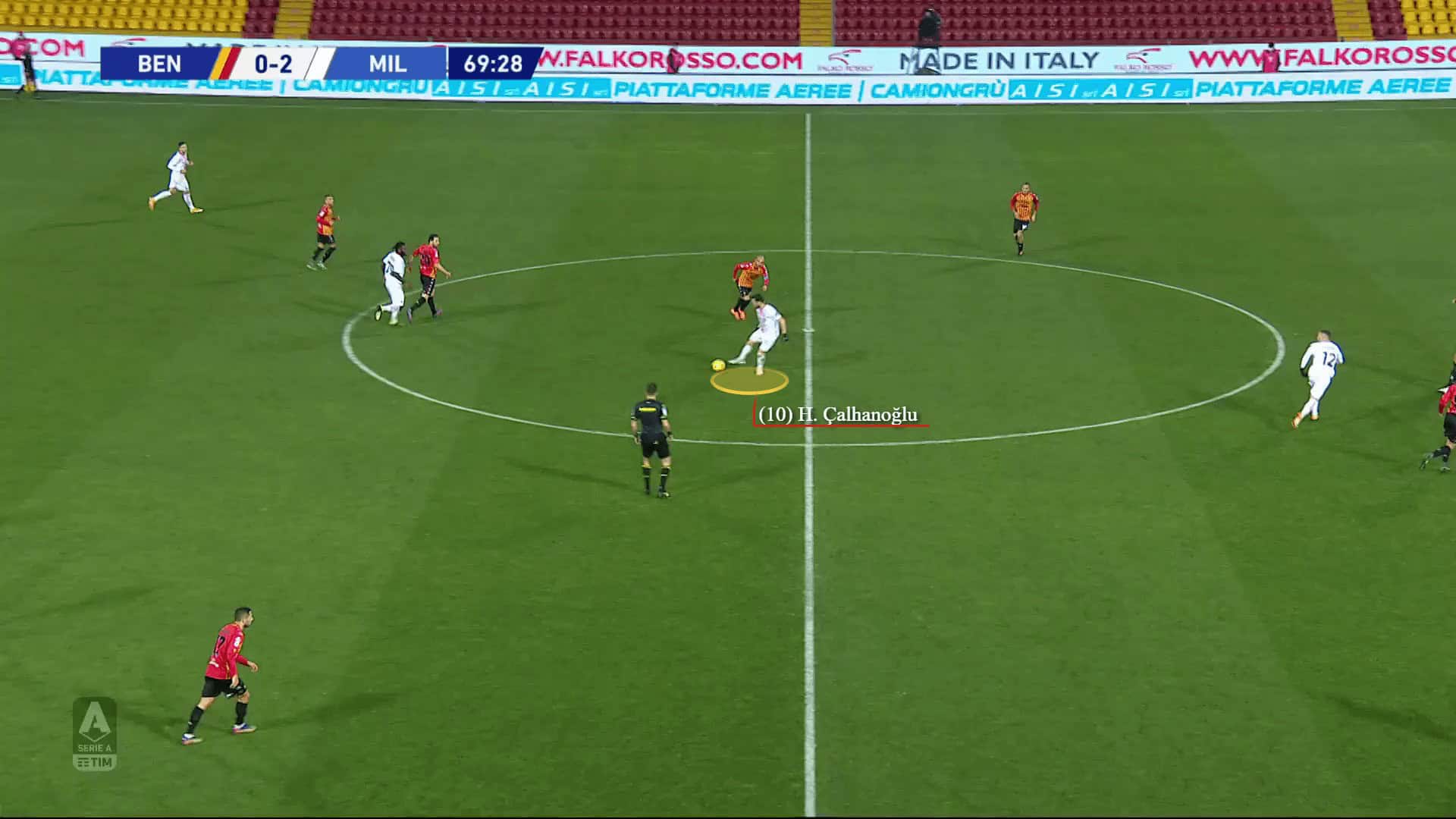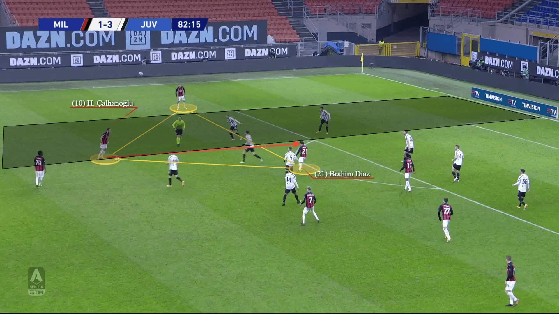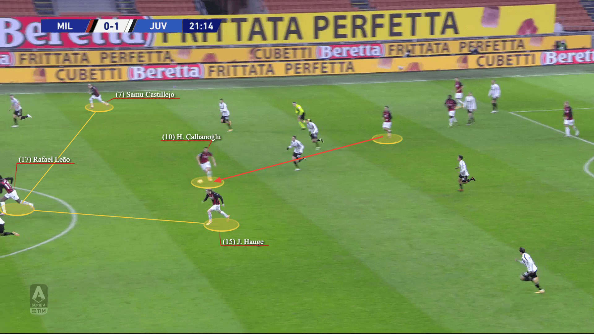 The team, though, wouldn’t only use the wide areas to expose their opponents. They can successfully penetrate through the central areas too. There, Kessié helps with ball progression but the key role goes to Çalhanoğlu who would drop deeper, often on the central line, to pick up the ball and advance it. He would be the main passing outlet whenever the team are looking to build-up through the central areas and then eventually spread out wide.