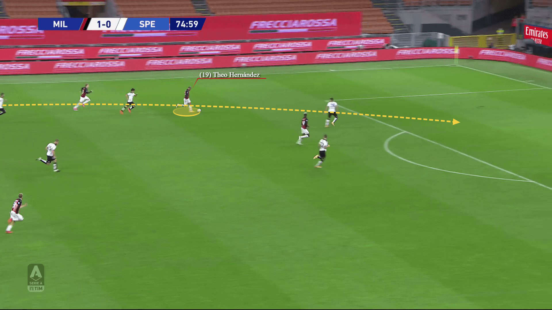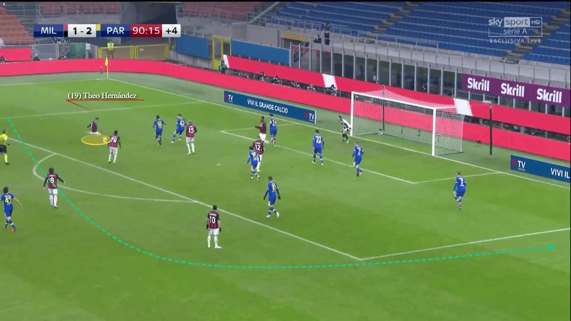 Milan have a solution against well-structured teams that employ low-blocks too. Whenever they struggle in positioning between the opposition’s lines and finding a way to penetrate, they would switch play and use the wide players’ movement to quickly break through and exploit the empty spaces while the defensive structures are leaning towards the overloaded areas. That would often happen on the right in order for Hernández to be used as a direct threat on the other side.