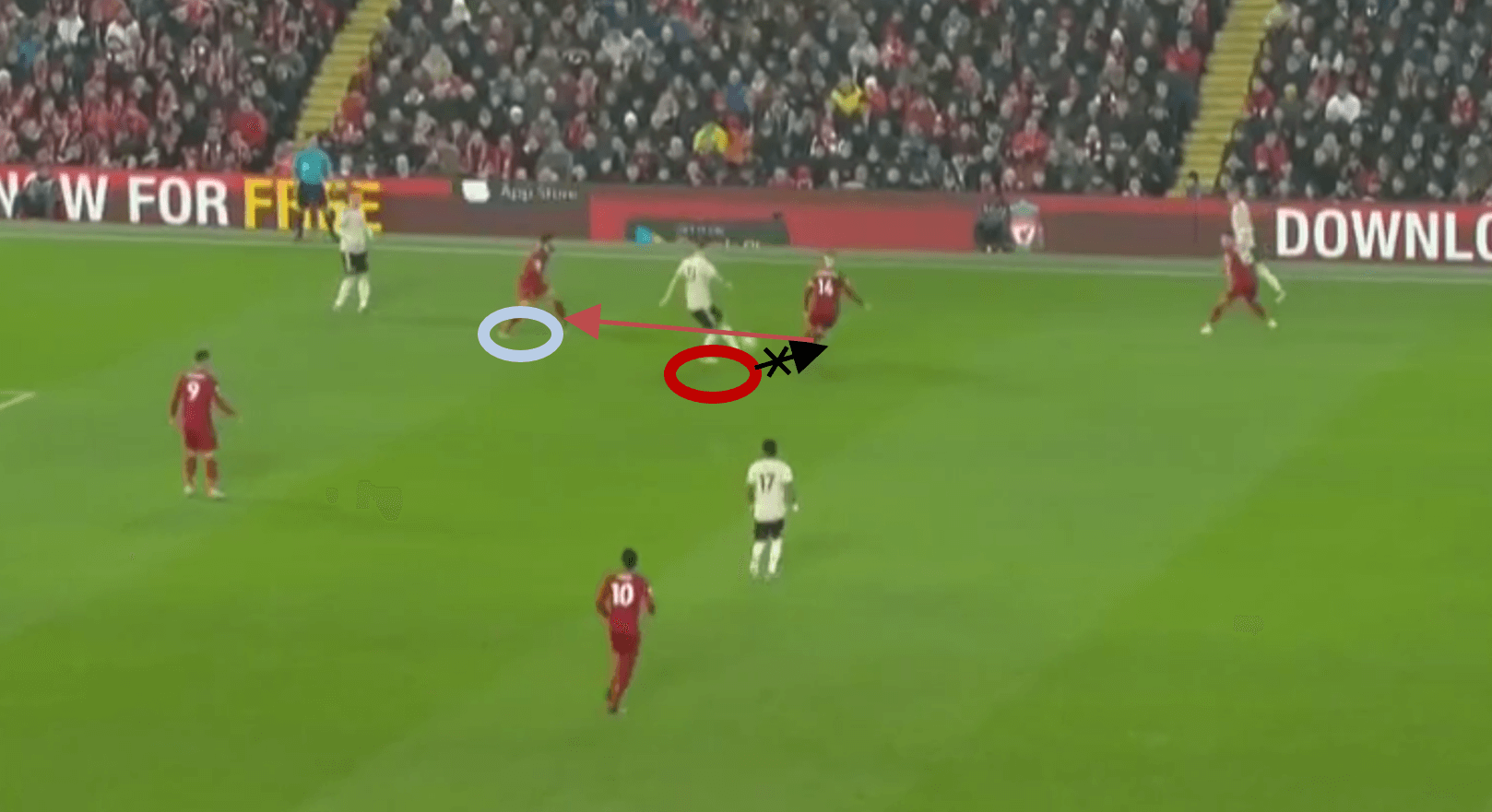 In the above example, United’s progression was denied by Liverpool due to an unsuccessful long pass. Matić was positioned in a good spot from where he could press the opponent if United lost possession. However, this positioning also gave him a good angle to pass if he was going to receive the ball.