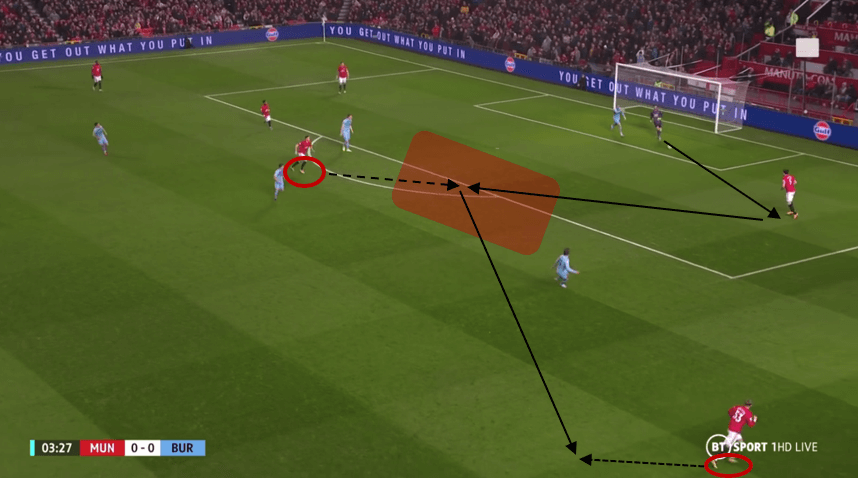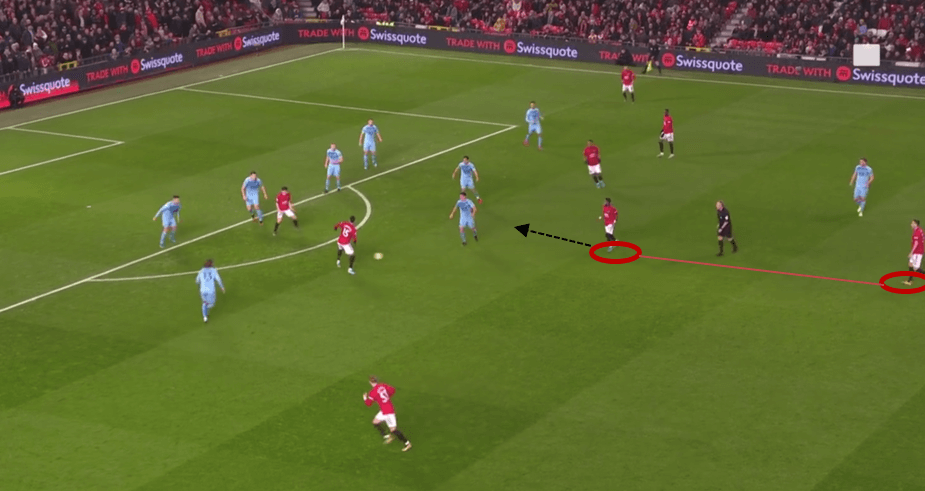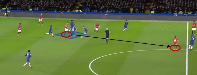 Therefore, Matić had to wait for the right moment: when Harry Maguire receives the ball on the left. Then, he used a one-touch pass to find the left-back, finding the free man for progressing the ball in an unmarked area.