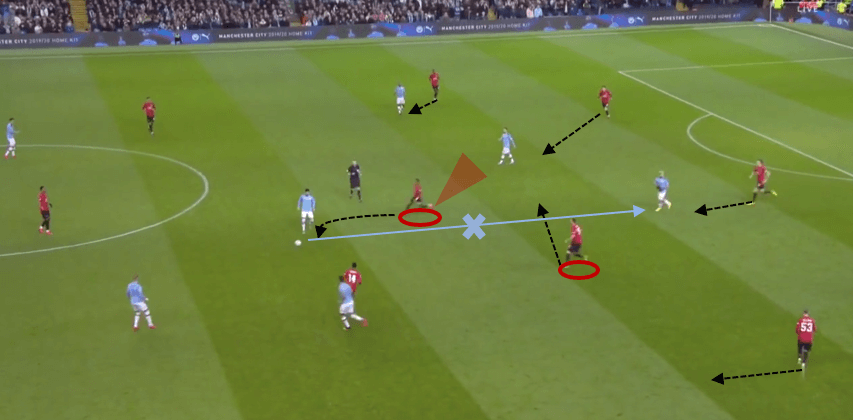 Matić saw this and shifted across the field, covering Fred. More importantly, he also eliminated another forward passing channel in the centre. Due to his positioning, now United’s whole block could move forward and press as a whole. Consequently, City didn’t have forward passing options in this scenario. They were forced to play back and United could move up further.