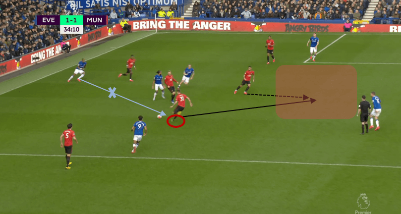 The above image is an example of his recovery in the midfield against Everton. This recovery eventually led to a goal for Bruno Fernandes. In this scenario, Everton were attempting to play out from the back and United pressed high. The ball was forced to the flank and Everton had an errant pass.