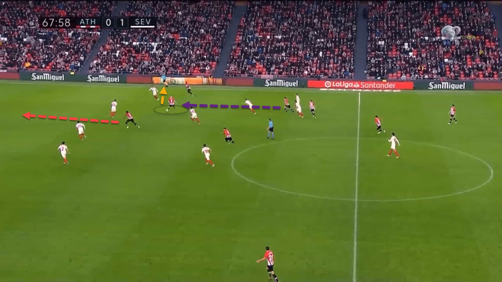 Here, after receiving the ball on the half-turn between the lines, instead of slipping Williams in on goal who was making an excellent run behind Sevilla’s backline, Sancet squares it to the right-back, playing safe.
