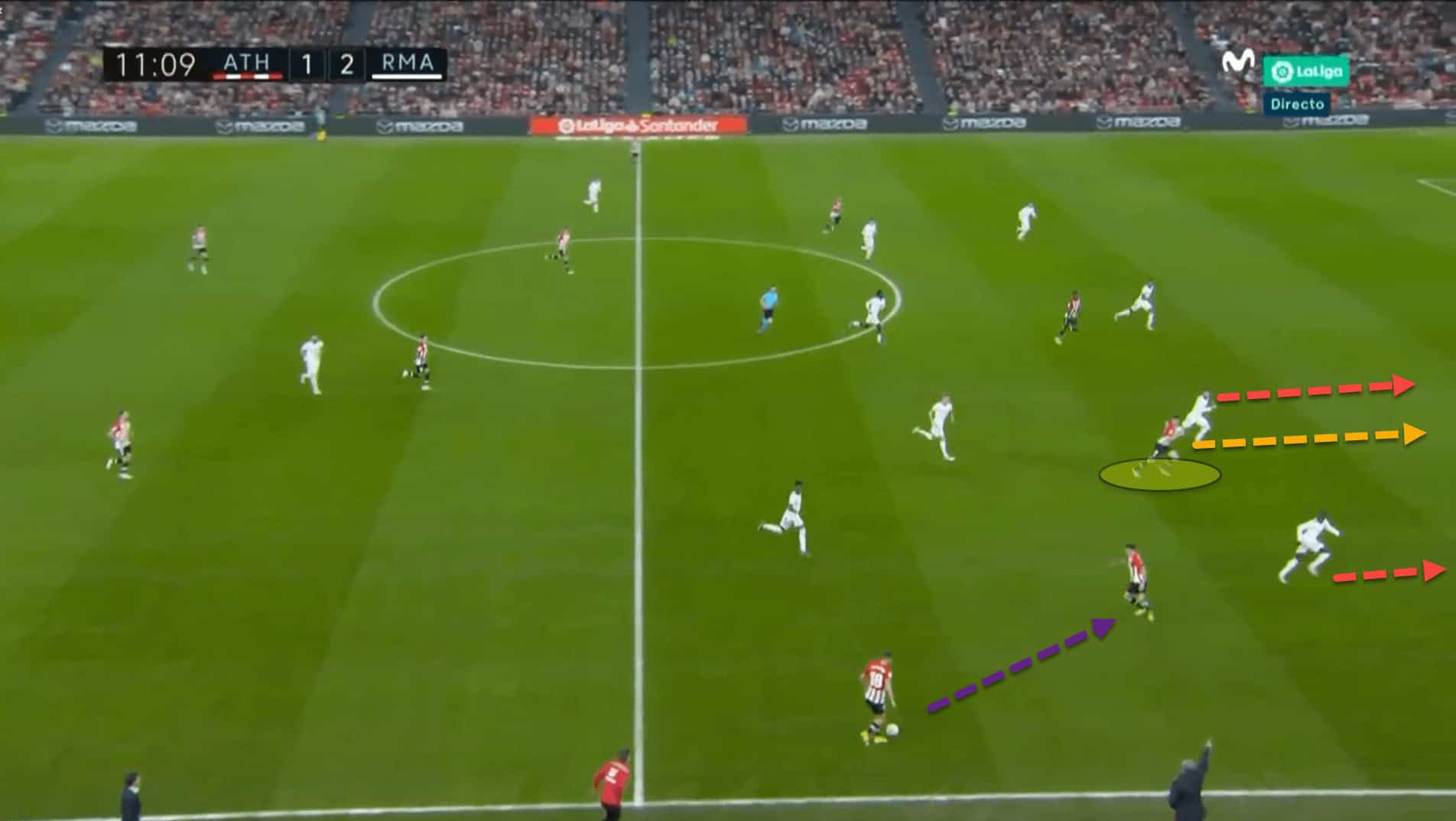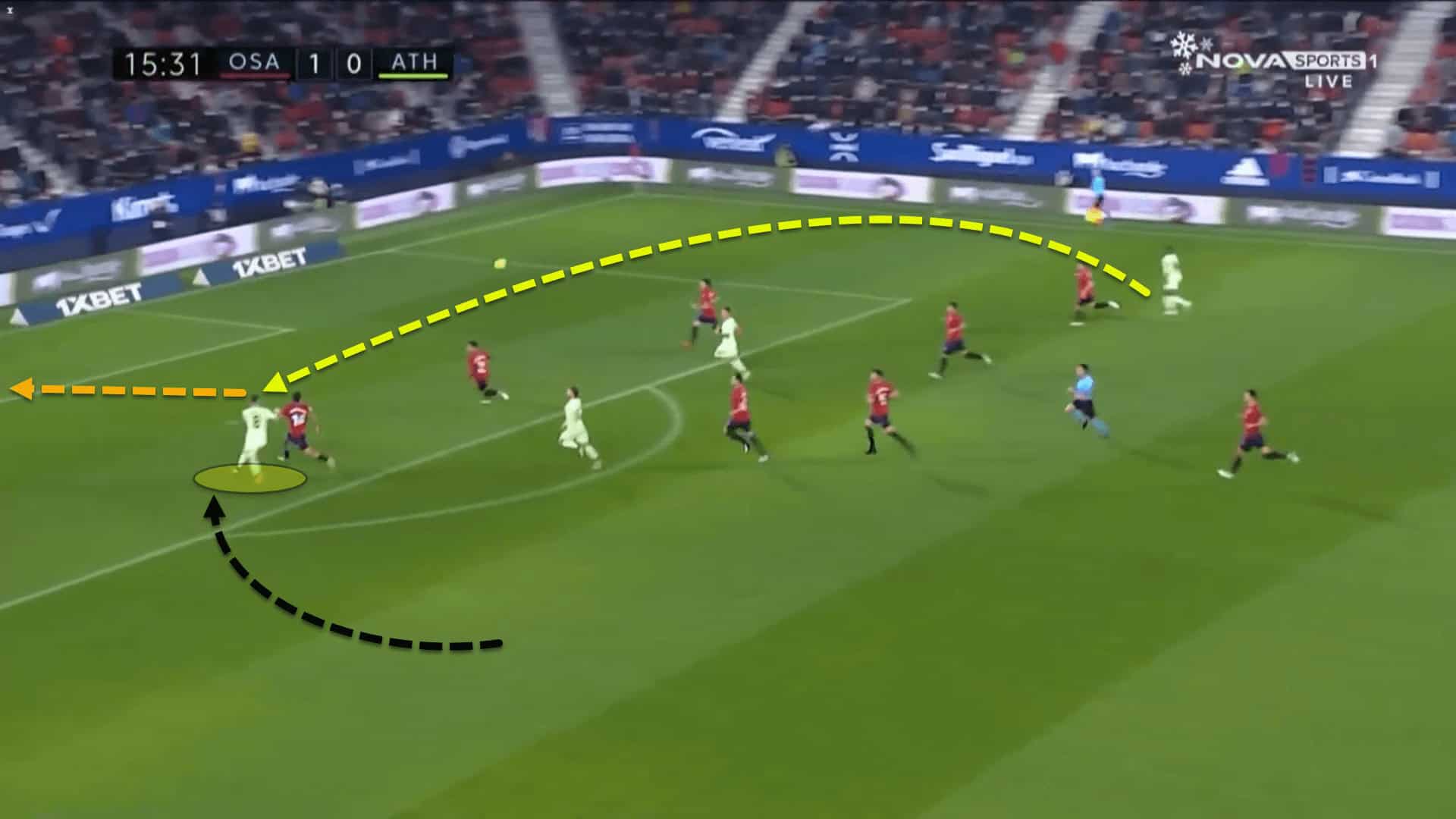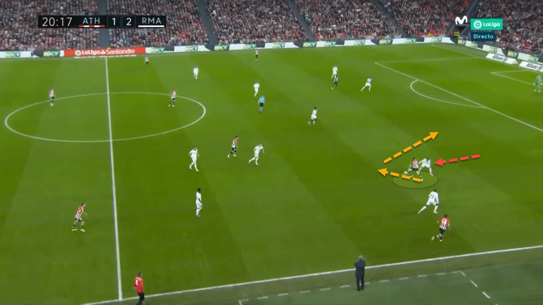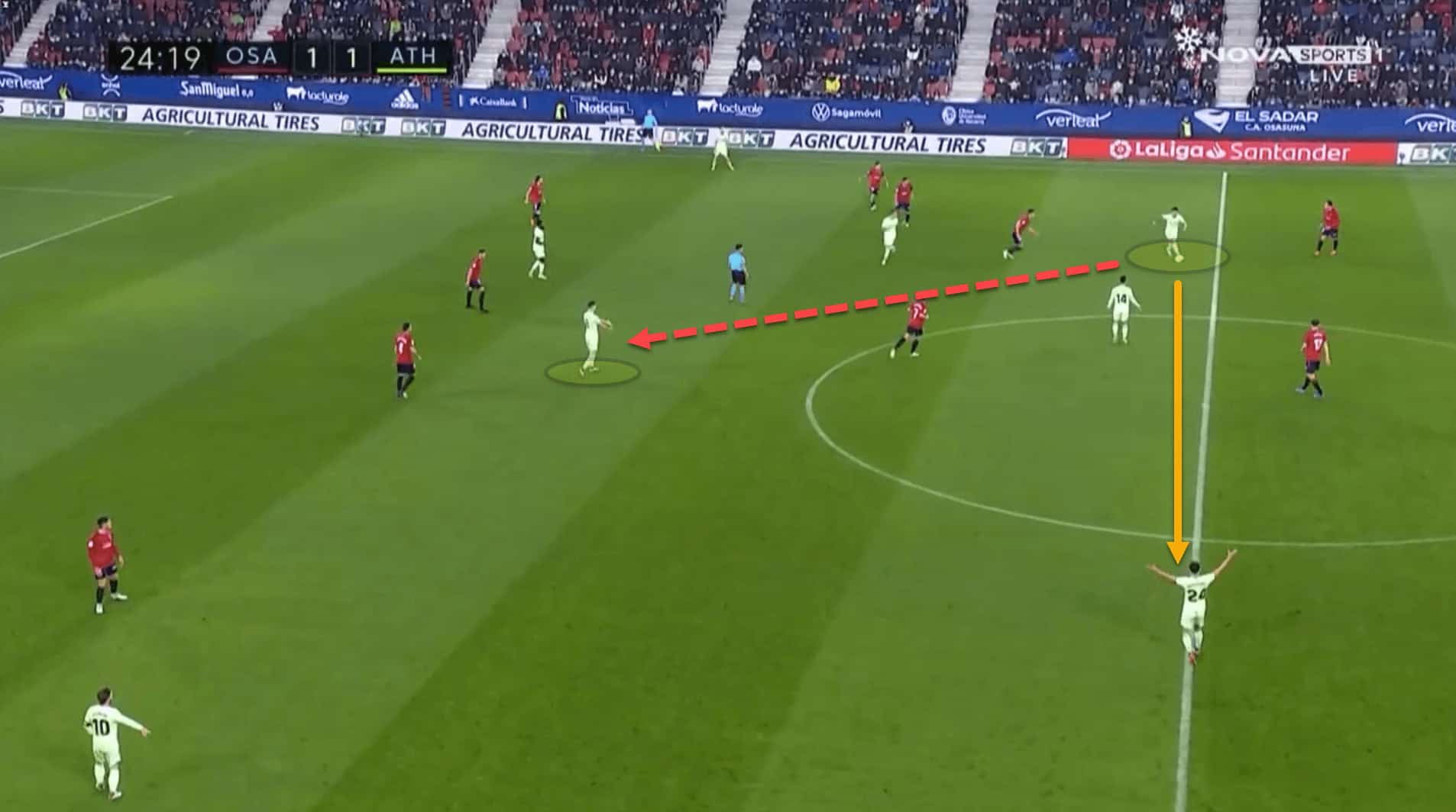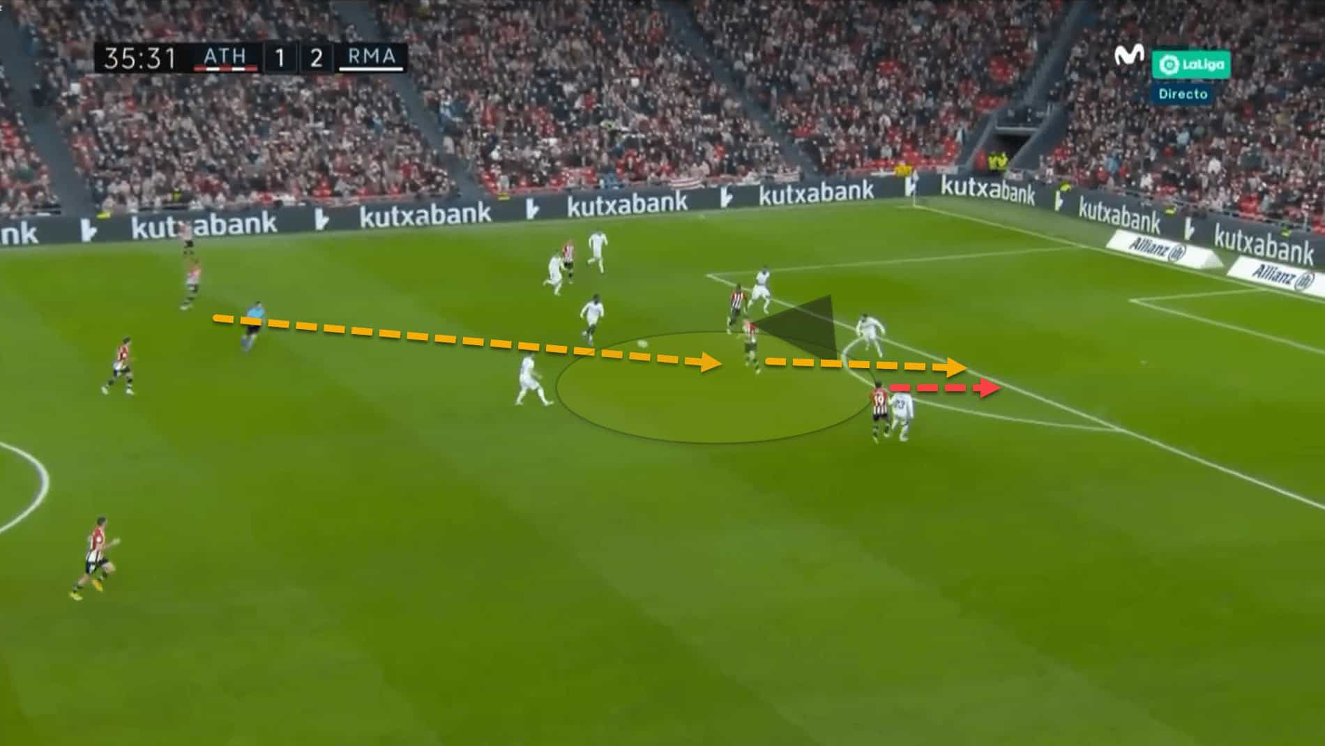 In this example, the attacker is screaming at Unai Vencedor to pass him the ball. The 21-year-old is in a great position. Nevertheless, Vencedor is right-footed and not very comfortable playing on his left.