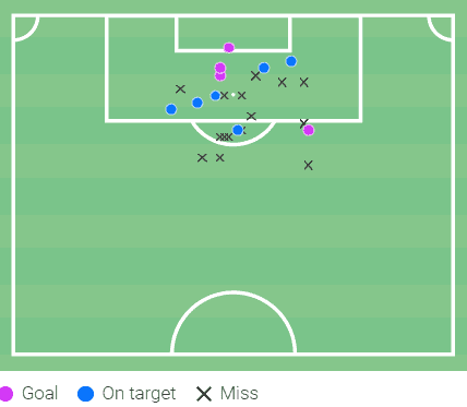 Most of his shots at goal are inside the 18-yard box, but Sancet still likes to take a number of strikes outside the area too, even scoring from one which was a breathtaking finish against Real Madrid back in December.