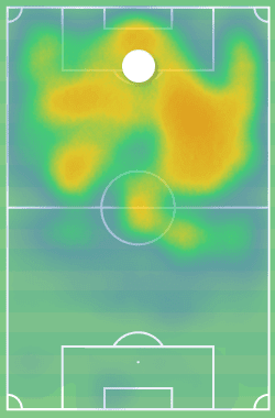 There is a clear tendency from the player to drop into the right halfspace, which stands out in his heat map. However, this is because he generally plays as the right centre-forward in the pairing, but he is still given license to drift wide as well as drop into really deep areas of the pitch.