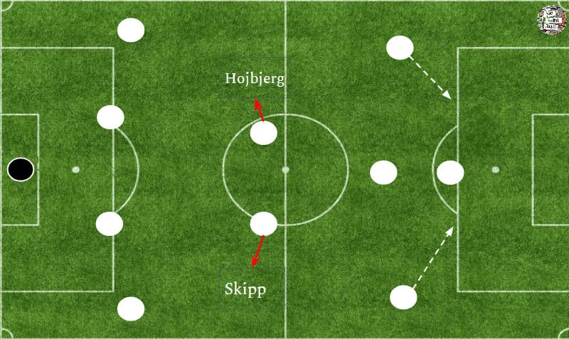 Skipp’s presence will considerably reduce Hojbjerg’s responsibility, as Skipp is much more superior on the ball than Winks or Sissoko.