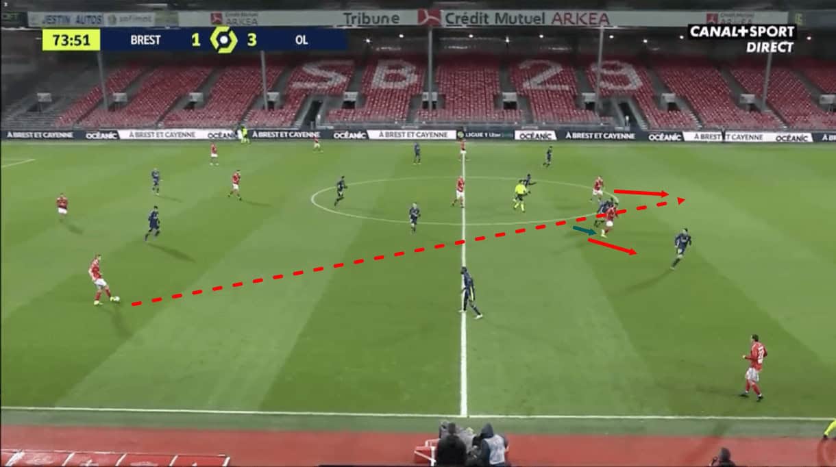 One potential area of weakness in Brest’s defensive setup is the space that they leave open out wide. In the previous two examples, we saw that Brest defend very vertically and horizontally compact, preventing the opposition from progressing the ball centrally.