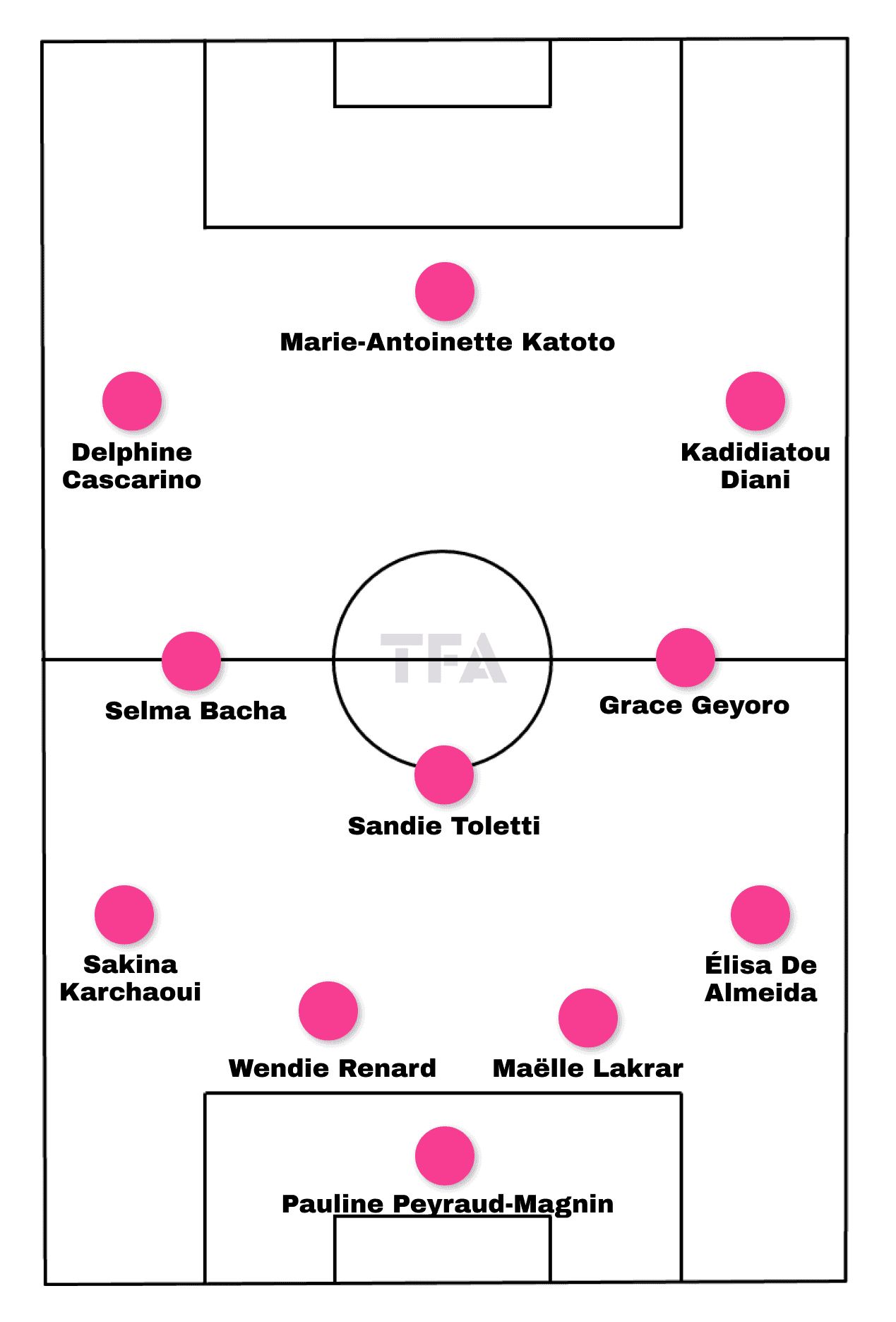 In attack, we’ve gone for Delphine Cascarino on the left, the 2023/24 UEFA Women’s Champions League top scorer Kadidiatou Diani of Lyon on the right and the same prestigious competition’s second-highest goalscorer, Marie-Antoinette Katoto of PSG through the middle.