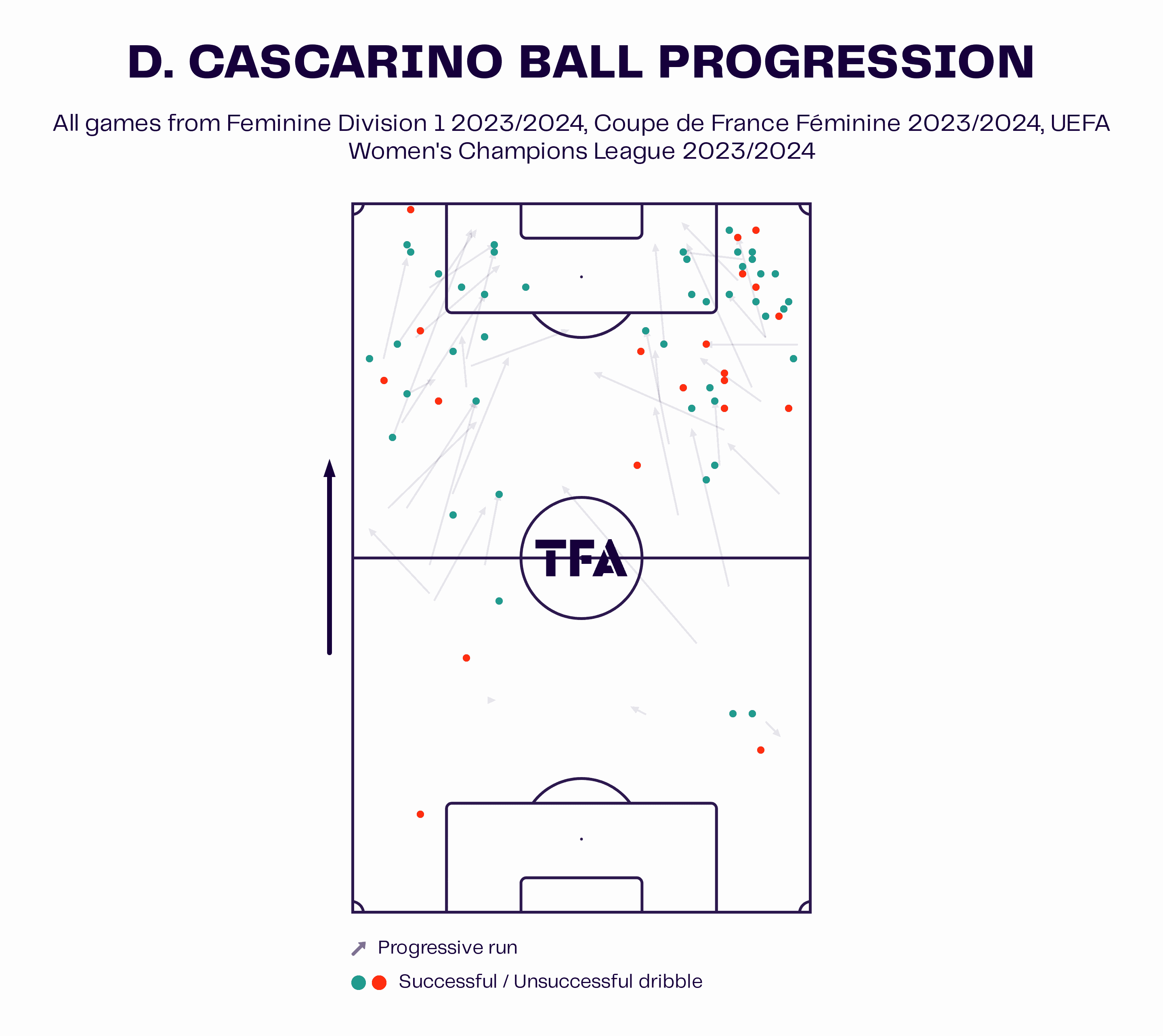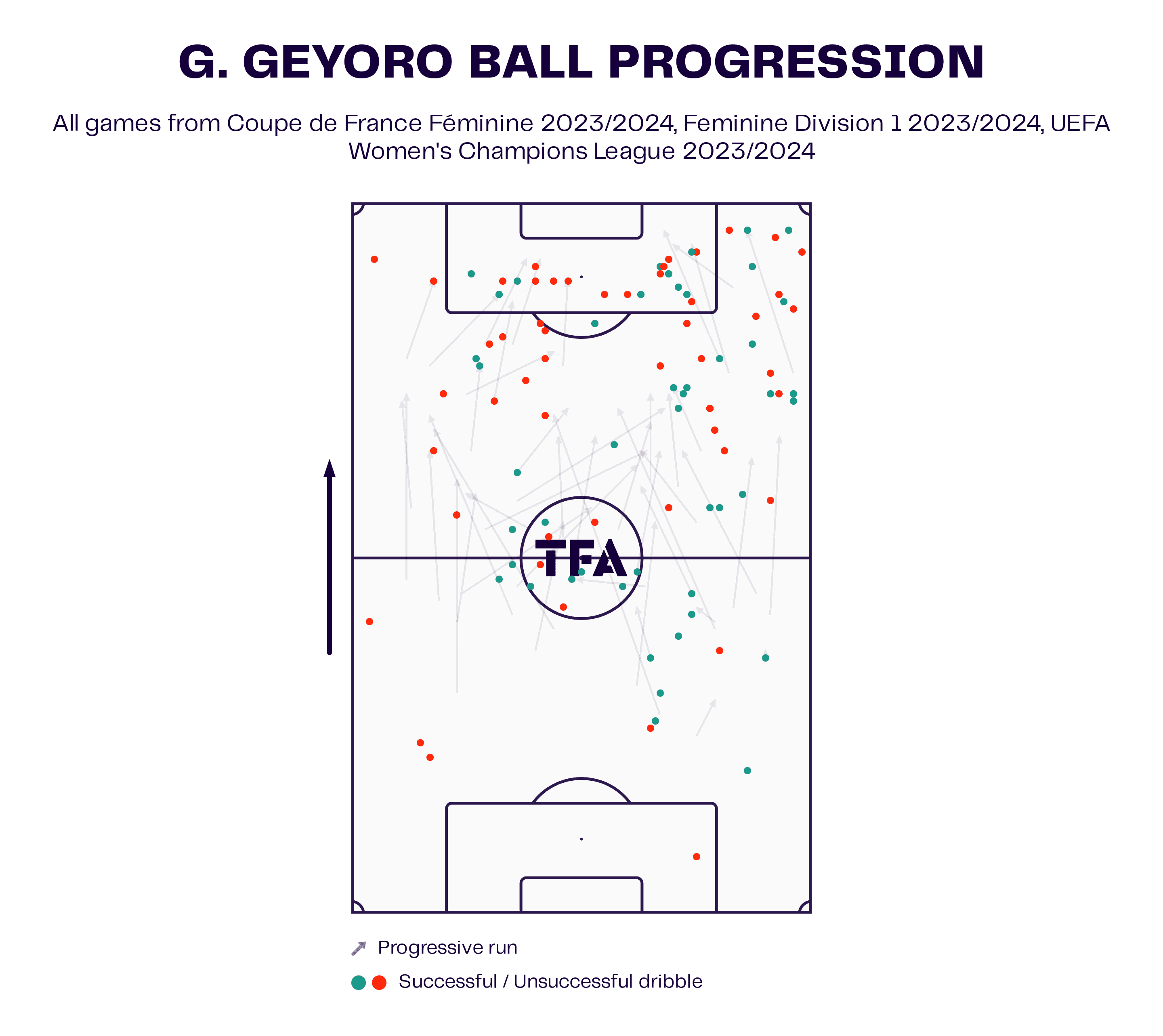 Right central midfielder Grace Geyoro is never shy to demand the ball and try to take opponents on with it at her feet — see her ball progression map from the 2023/24 campaign above. Expect her to prove vital to France’s attack and transitions to attack this summer.