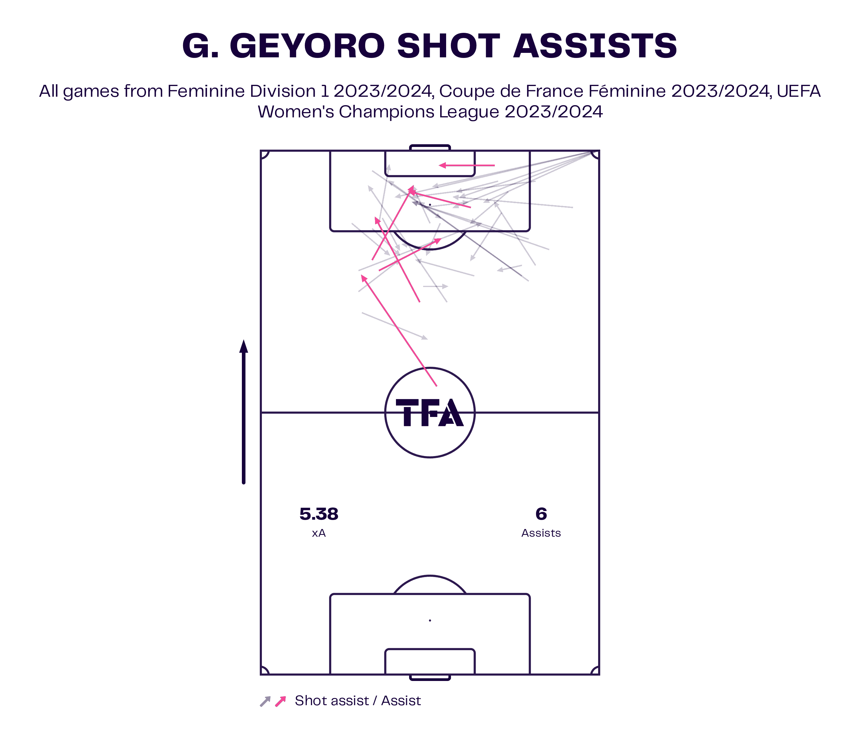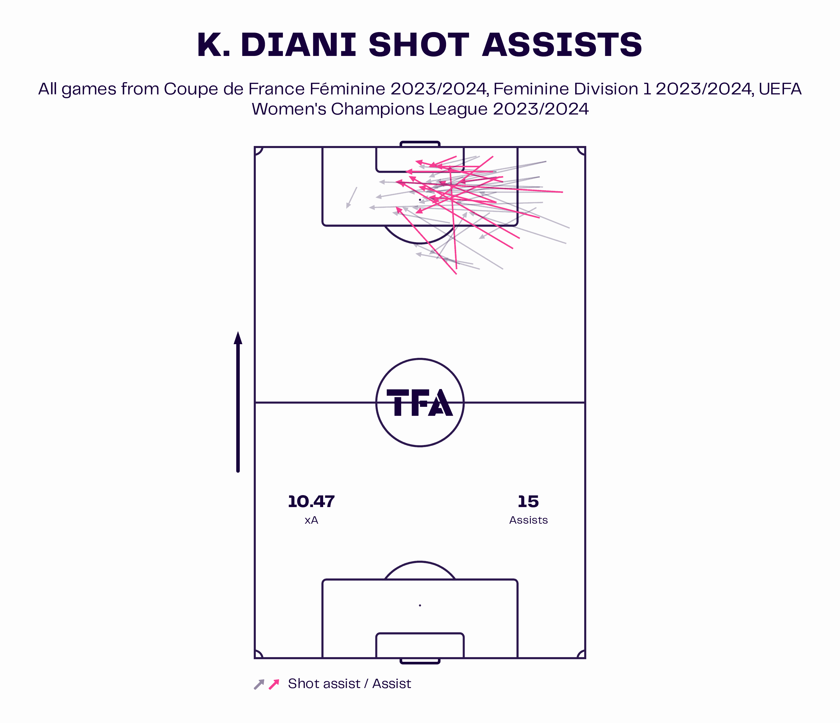 Not just a goalscorer, Diani will also bring creativity to the French forward line. This past season with Lyon, she generated 10.47 xA and contributed 15 assists— see the locations of her shot assists for 2023/24 in figure 15.
