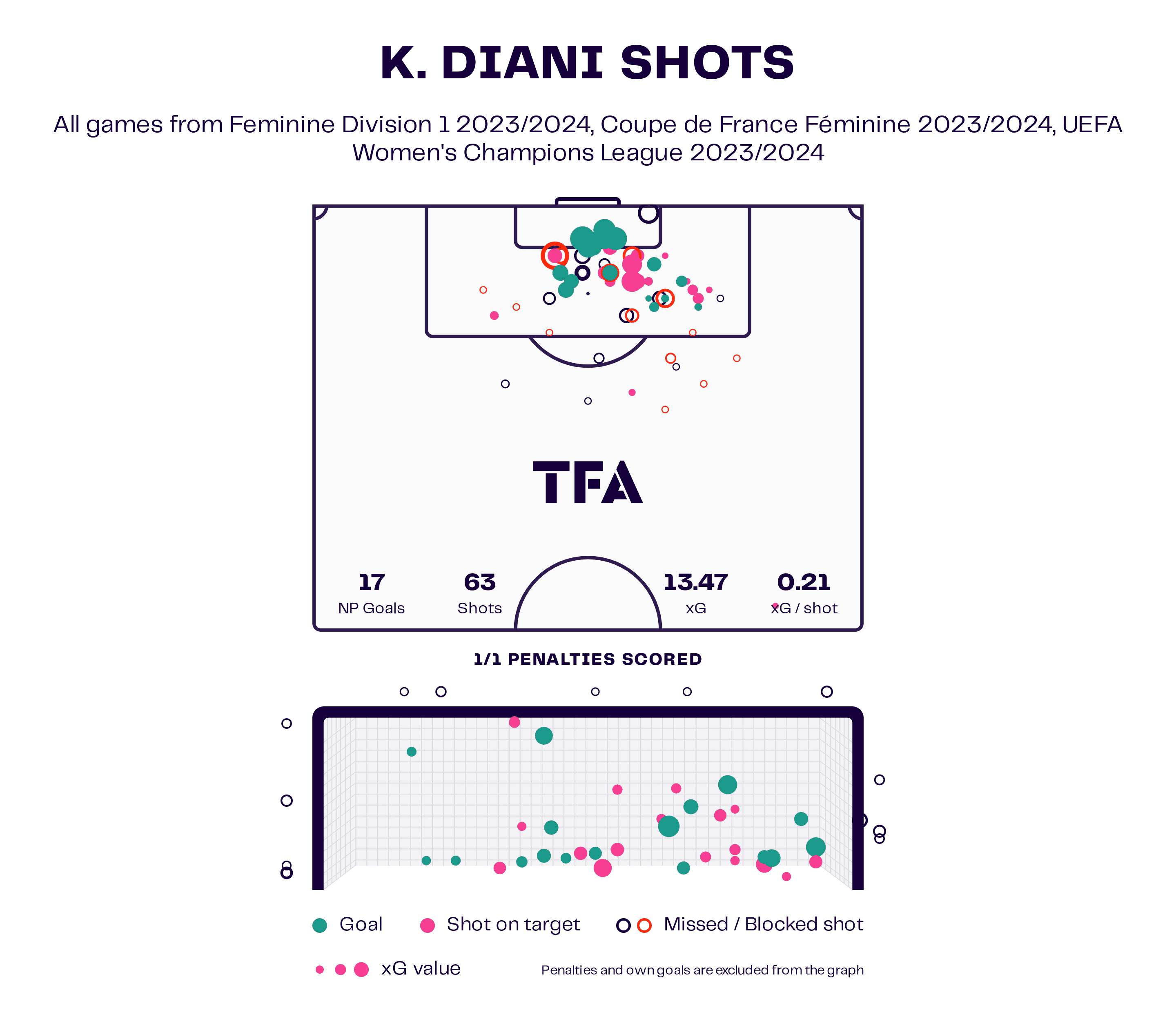 Diani is entering the Olympics from a stellar 2023/24 campaign in which she bagged 18 goals (17 non-penalty goals) in all competitions from 13.47 expected goals (xG).