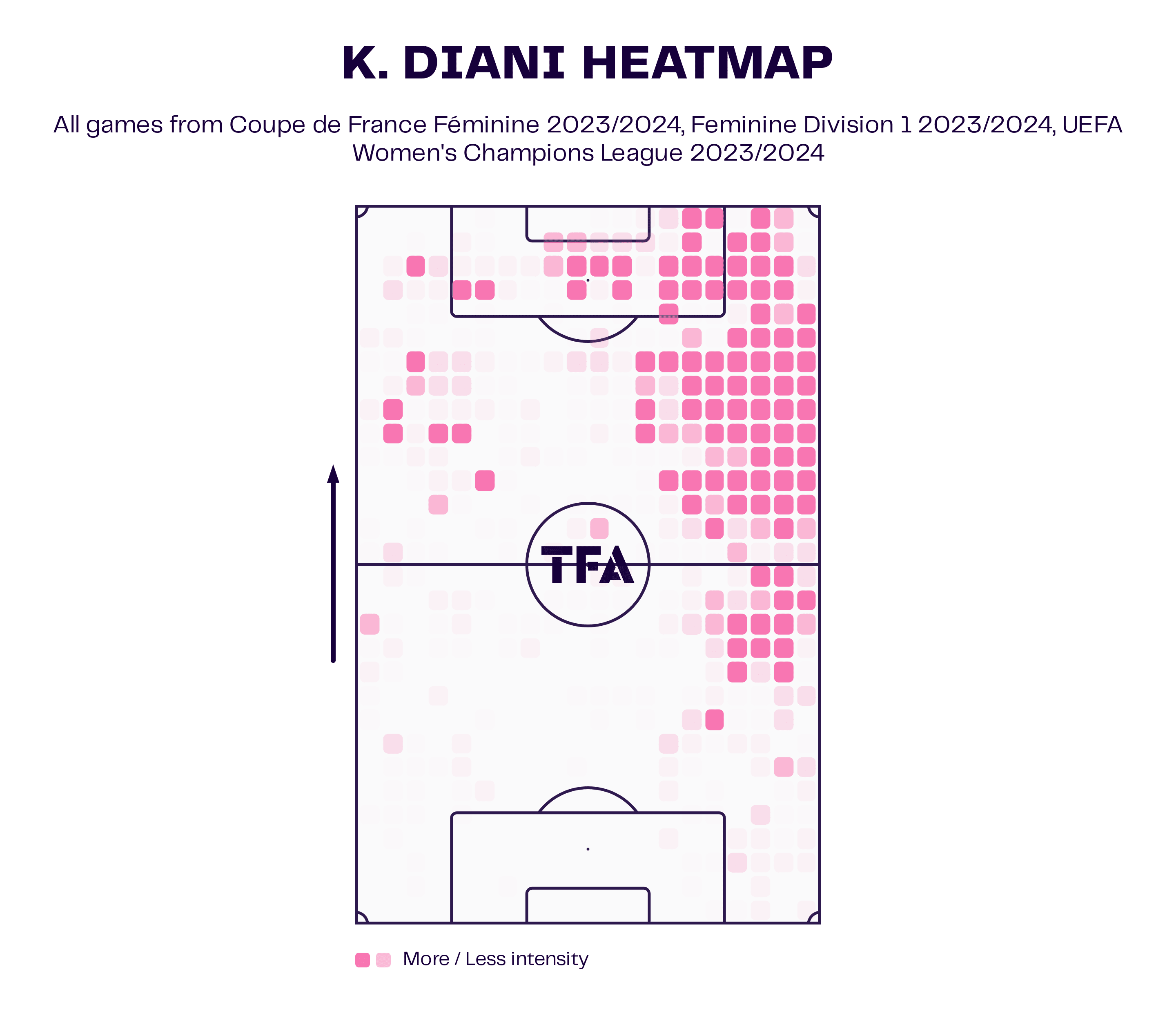 As per her 2023/24 shot map in figure 13, the forward mainly shoots towards the ‘near’ post from her side of the pitch, with Diani typically operating on the right side of attack, as indicated by our expected lineup back in figure 1 and her heatmap from the 2023/24 campaign in figure 14 below.