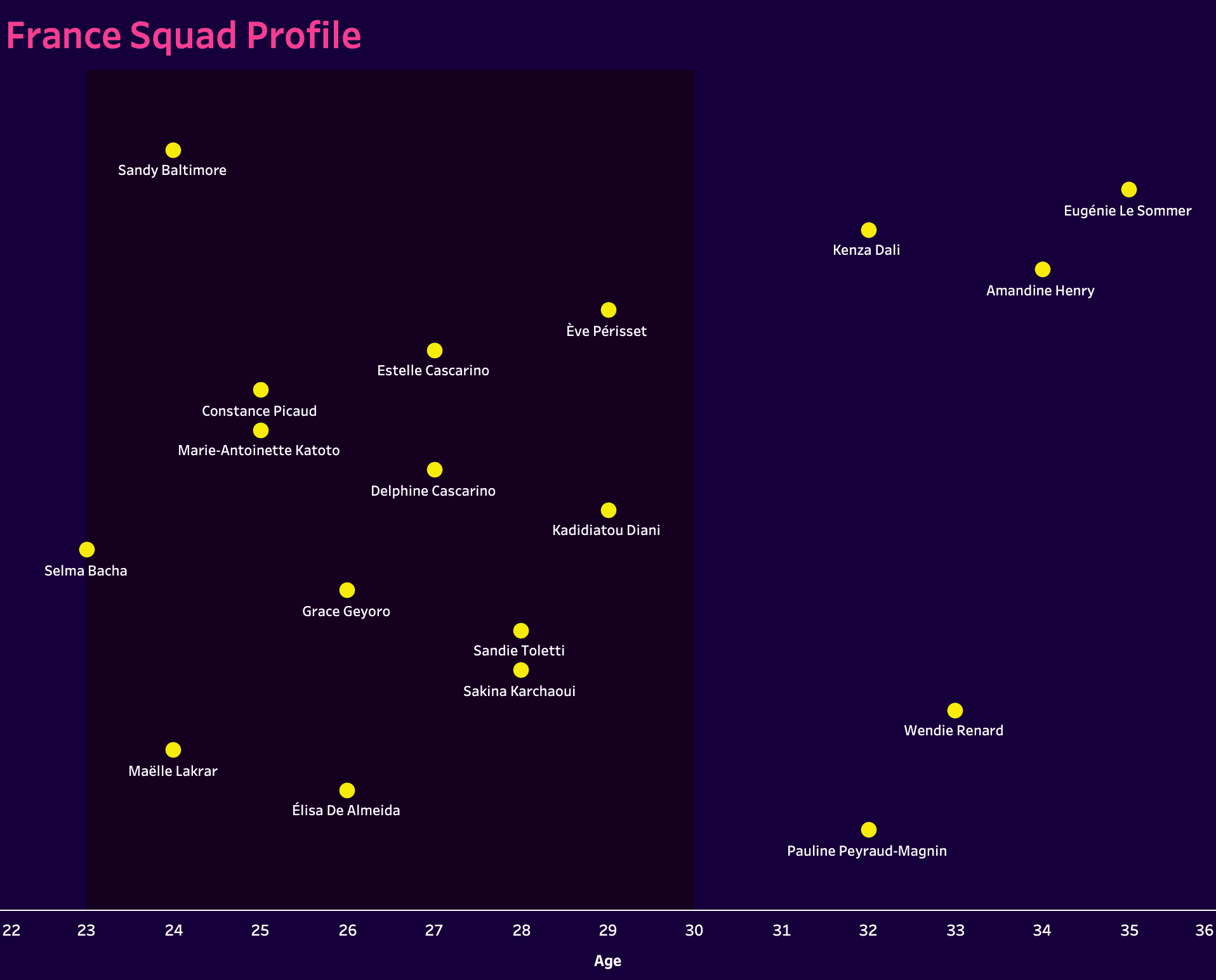 That leaves us with a fairly experienced squad for the tournament featuring just one player aged 23 and under — Selma Bacha — with five over 30, including goalkeeper Peyraud-Magnin and captain Wendie Renard.