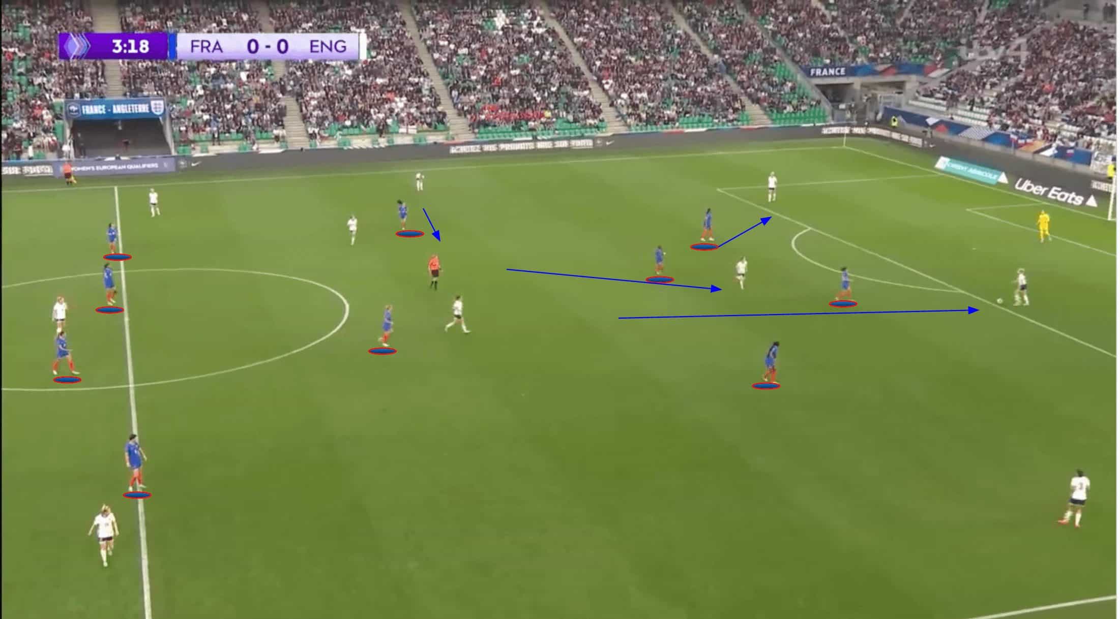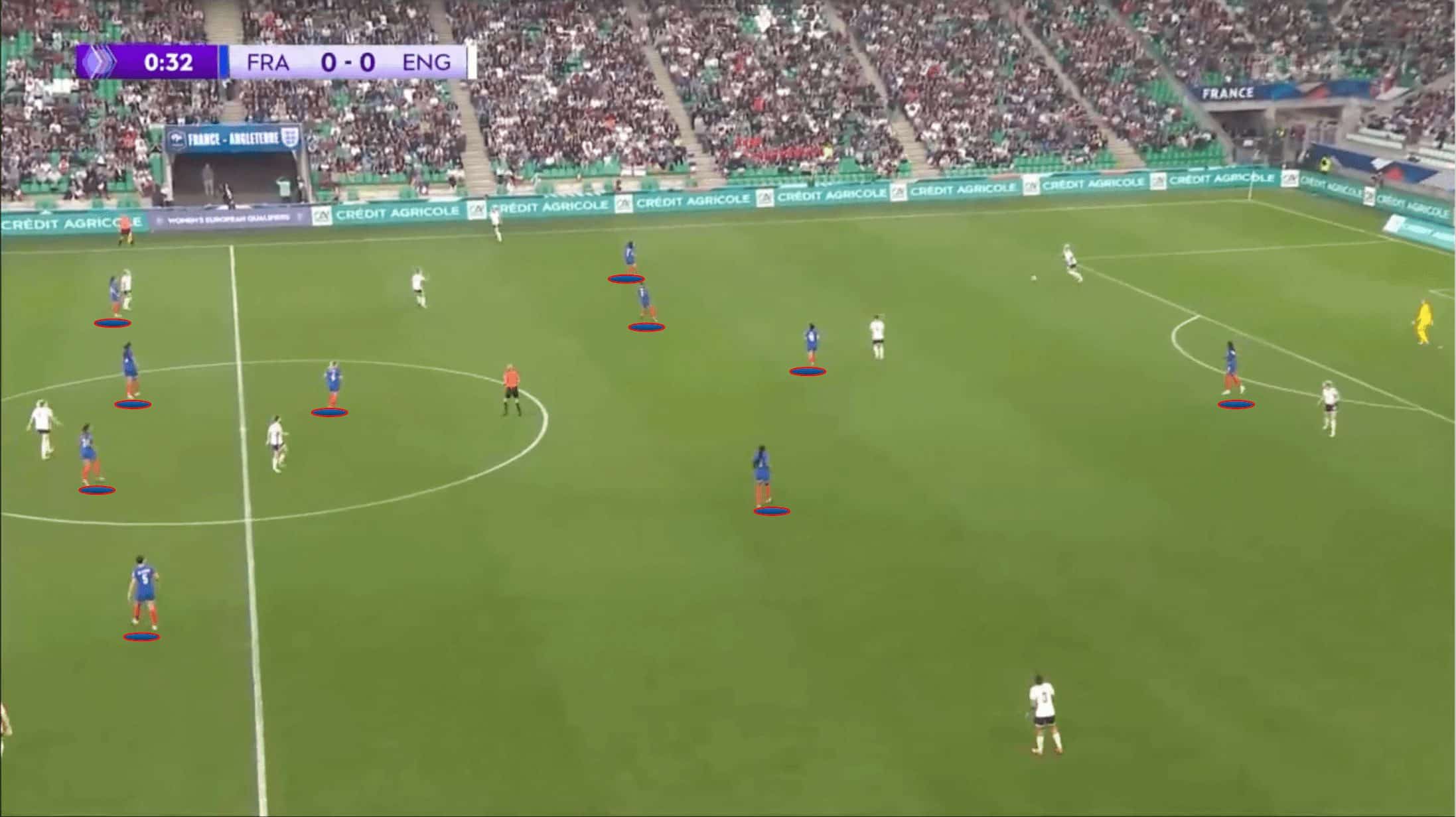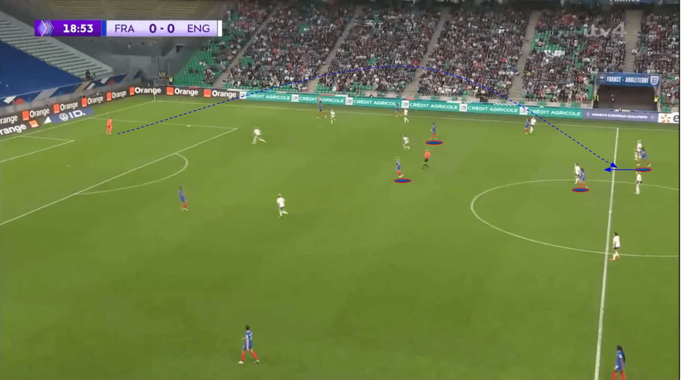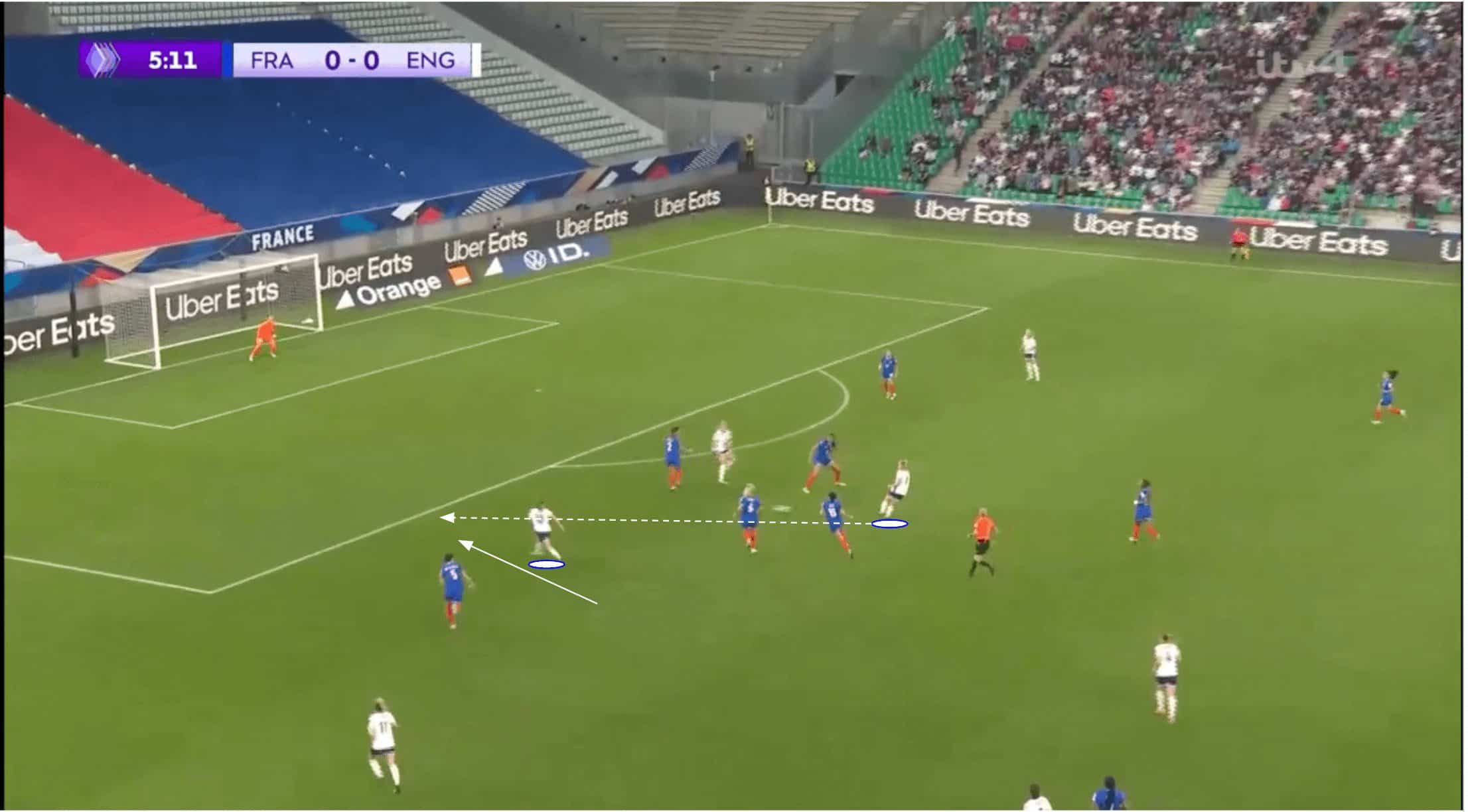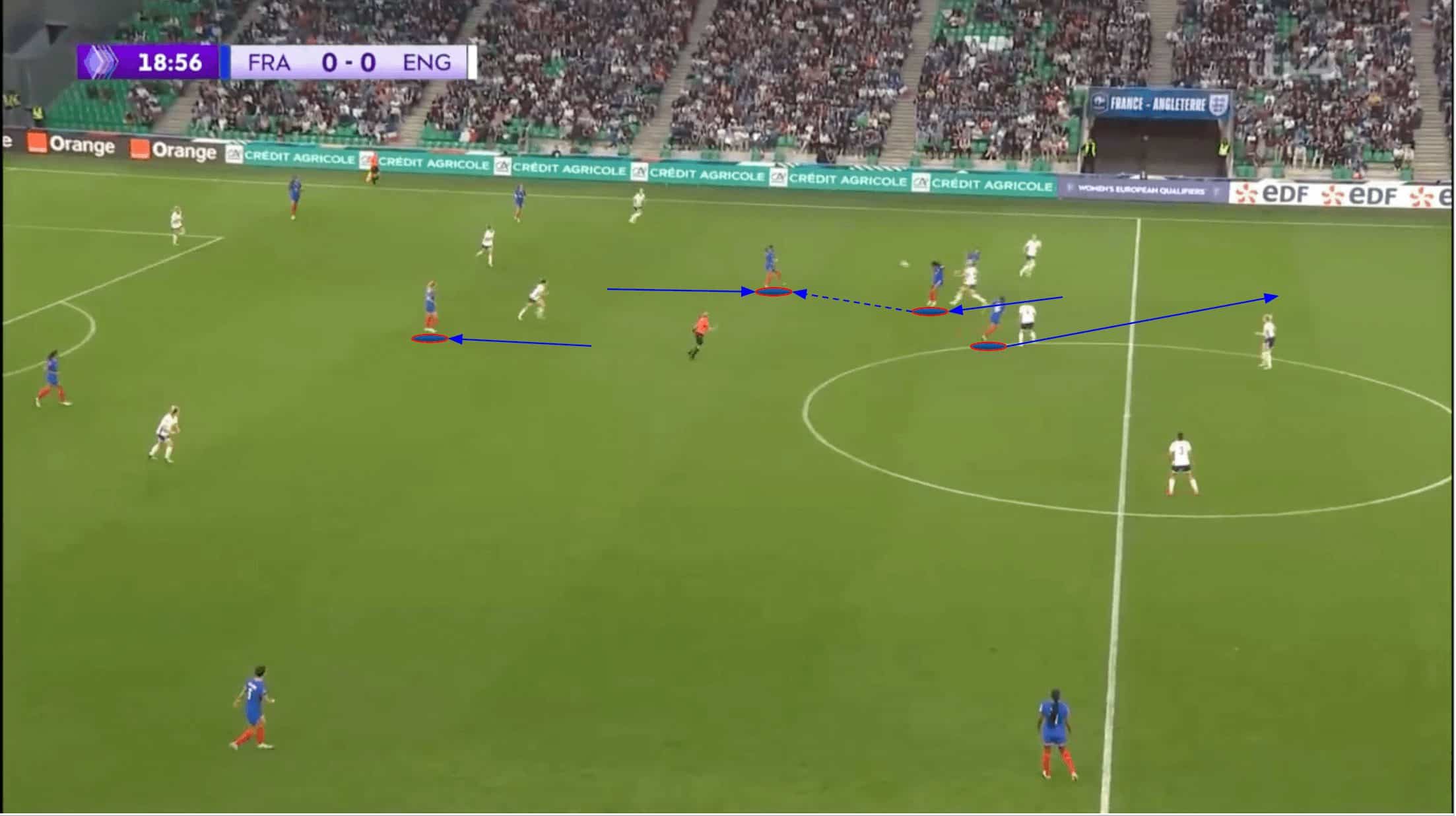 This directly resulted from a cheap loss of possession in the middle third. France’s opponents should aim to create similar opportunities in transition during the Olympics if they want to maximise their chances of troubling Les Bleues’ net.