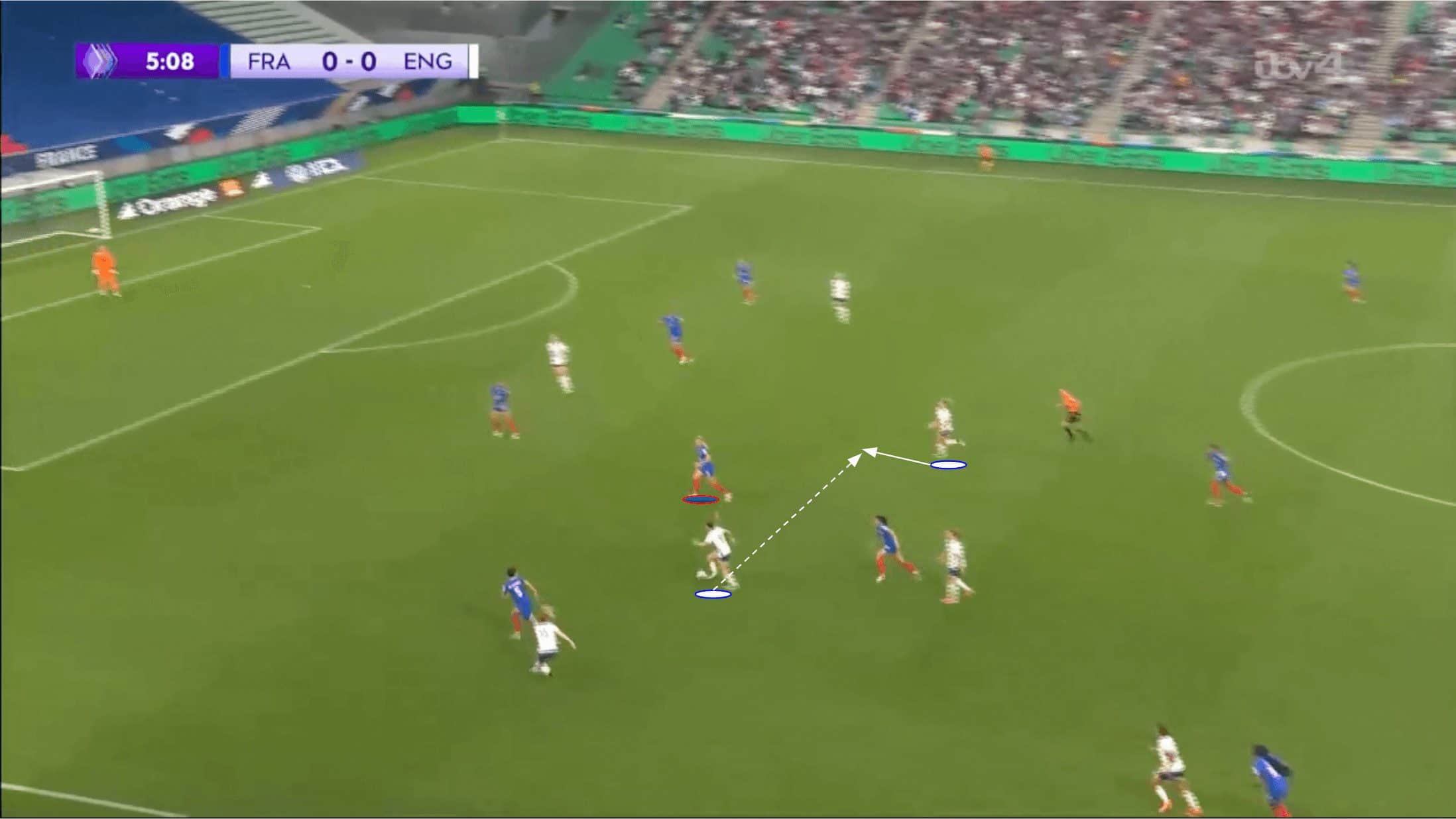 France generally like to play out through their centre-backs from the build-up, but captain Renard’s ball-playing ability exceeds that of Lakrar. The latter could be targeted with an intelligent pressing scheme, especially due to her tendency to carry the ball into wider areas on receiving. This leaves her open to being pressed hard from out-to-in, forcing her into a rushed action.