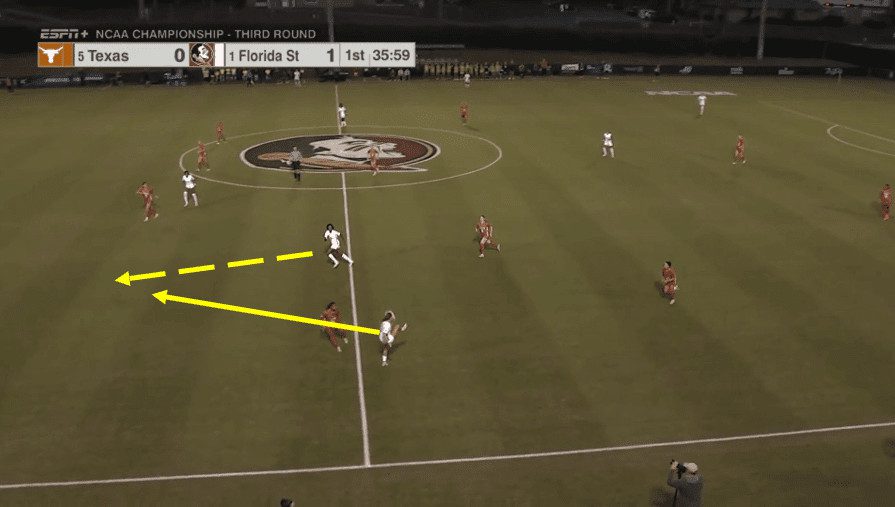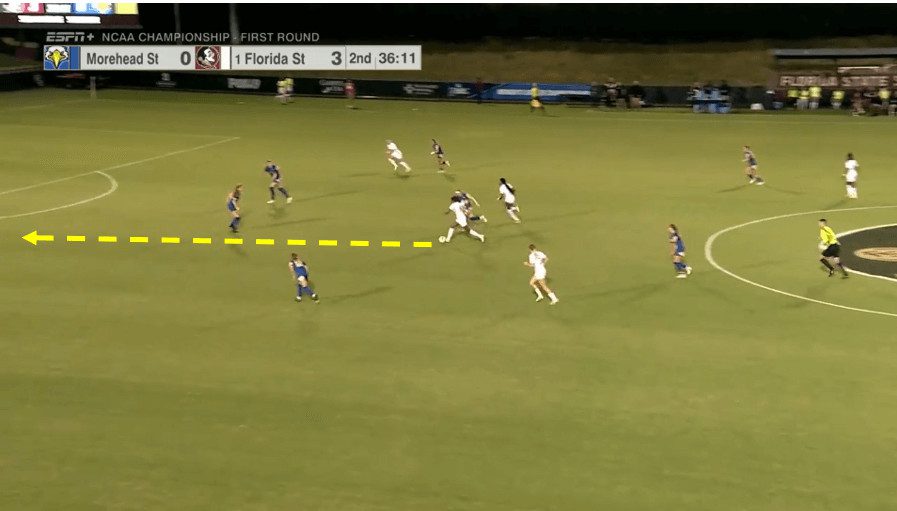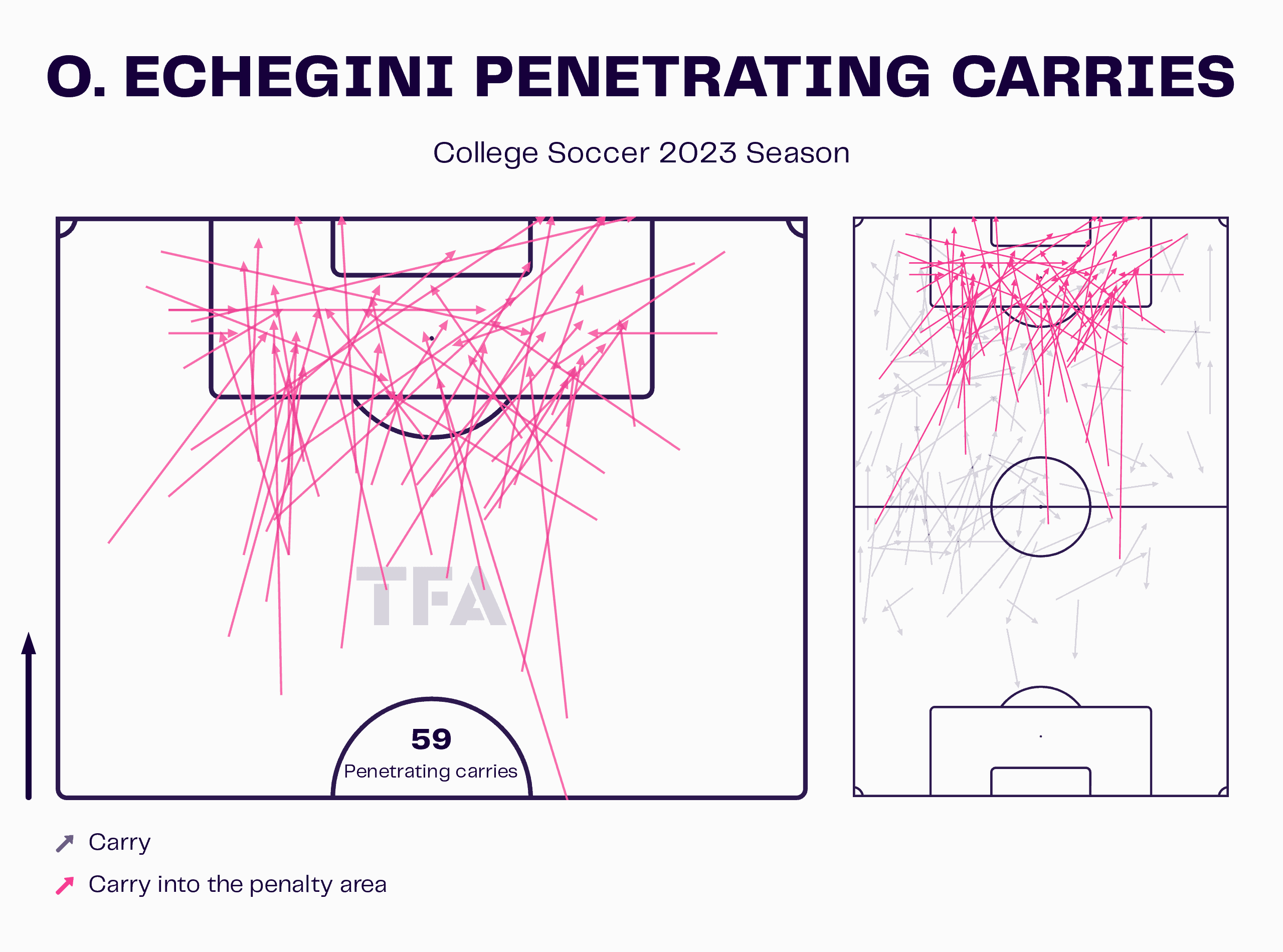 Throughout the 2023 College soccer season, she has averaged 2.1 completed dribbles per game at a success rate of 58%. This only tells half the story, though, as the graphic above shows. A number of those carries are for significant yardage. This makes her a real asset when carrying attacks forward, particularly coming out of the defence-attack transitions. With 59 penetrating carries throughout the season, many of which were into the box itself. She was able to drive forward on the ball from out wide and through the middle of the opposition, taking the opposition midfield out of the game.