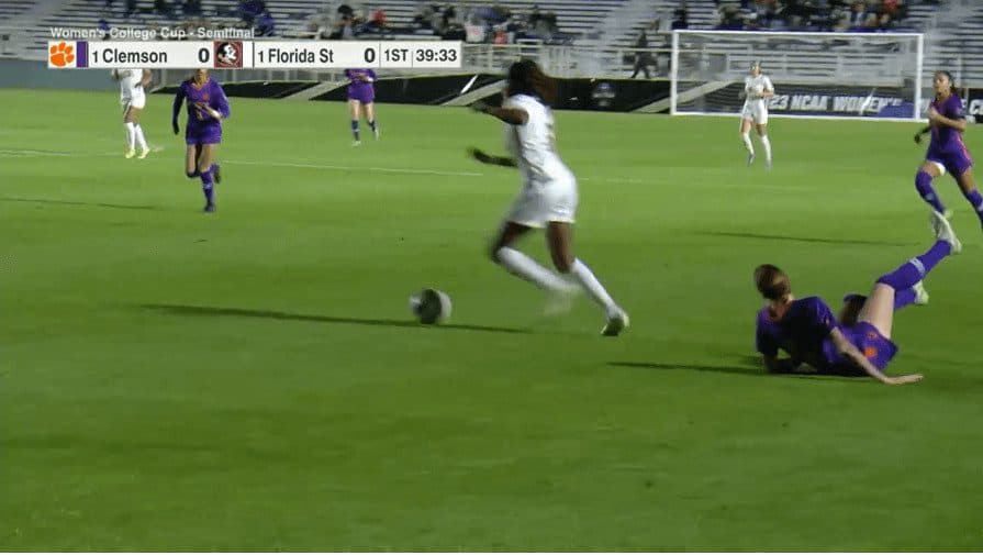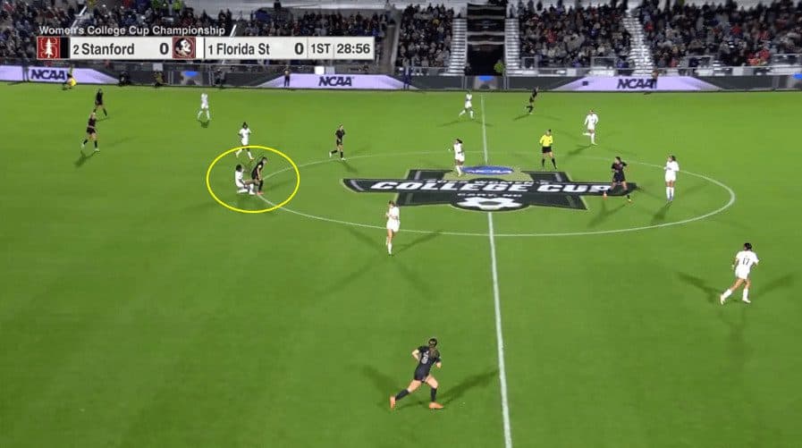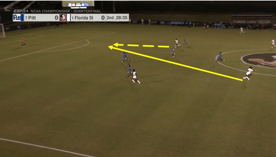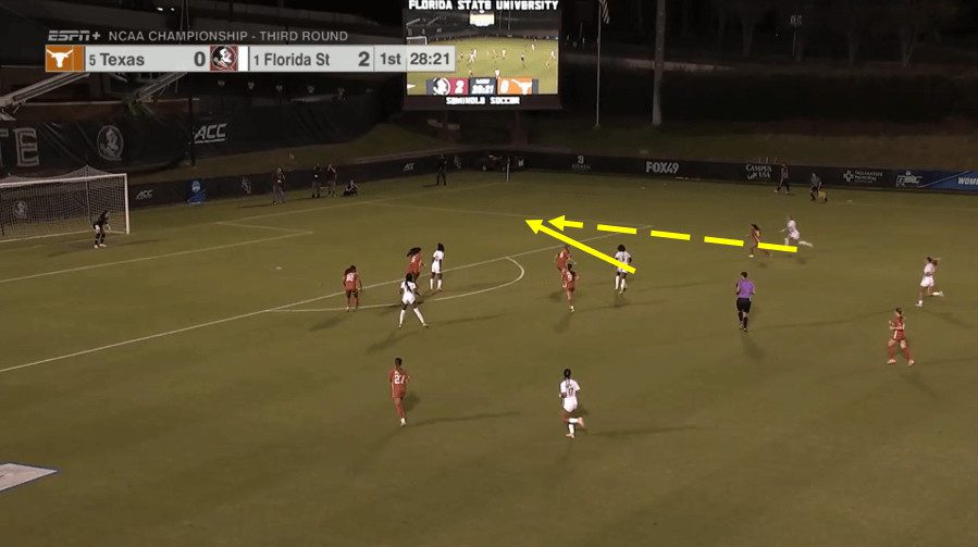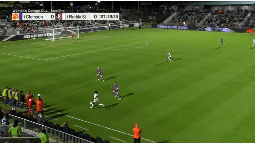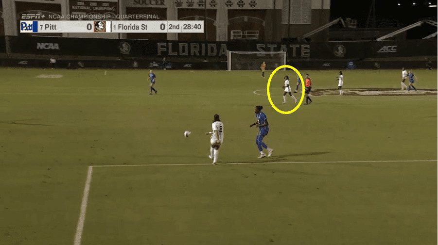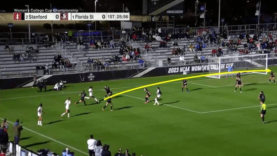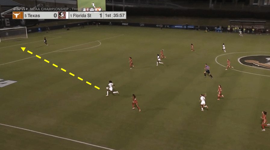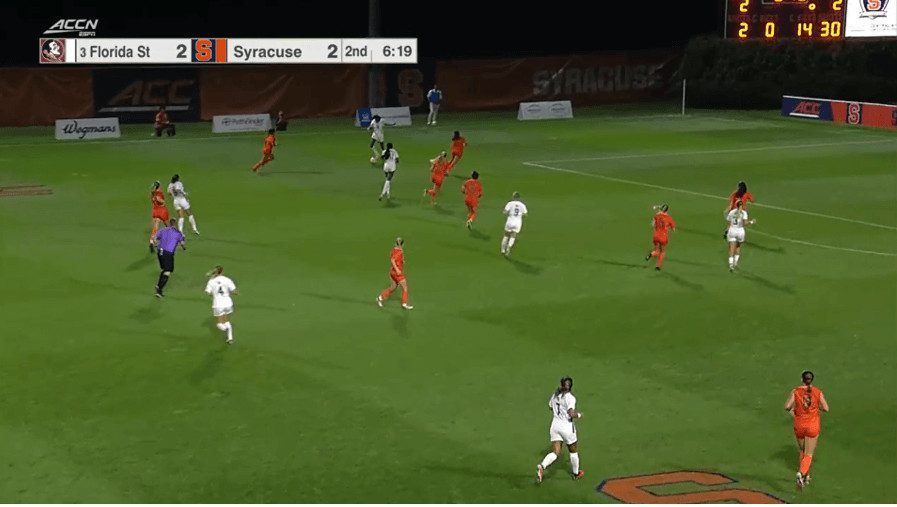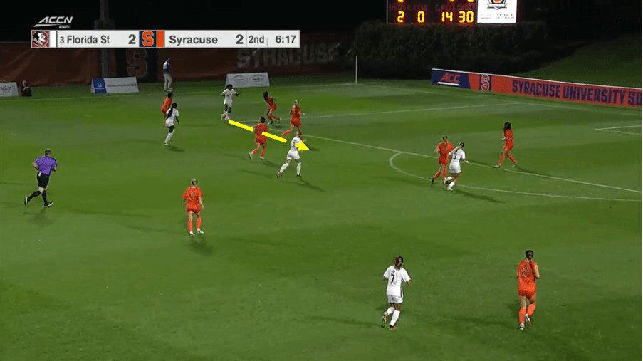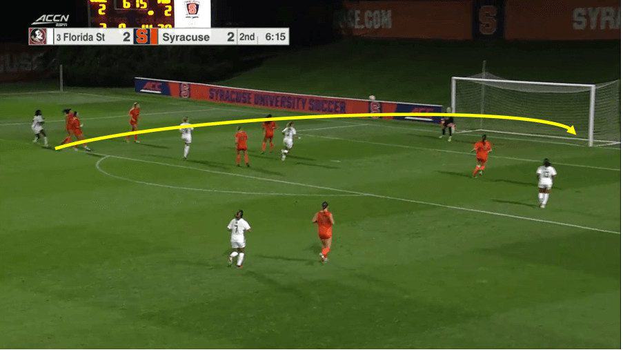 In this example, you can see the fear that she puts into opposition defenders when she has the ball as the Syracuse defender starts to backpedal and flips her hips inwards, which invites Echegini to drive inside onto her favoured right foot. Nonetheless, when she has cut inside, she hits an excellent right-footed shot into the bottom corner of the goal. The ball hit with too much pace for the goalkeeper to be able to react in time to make a save.