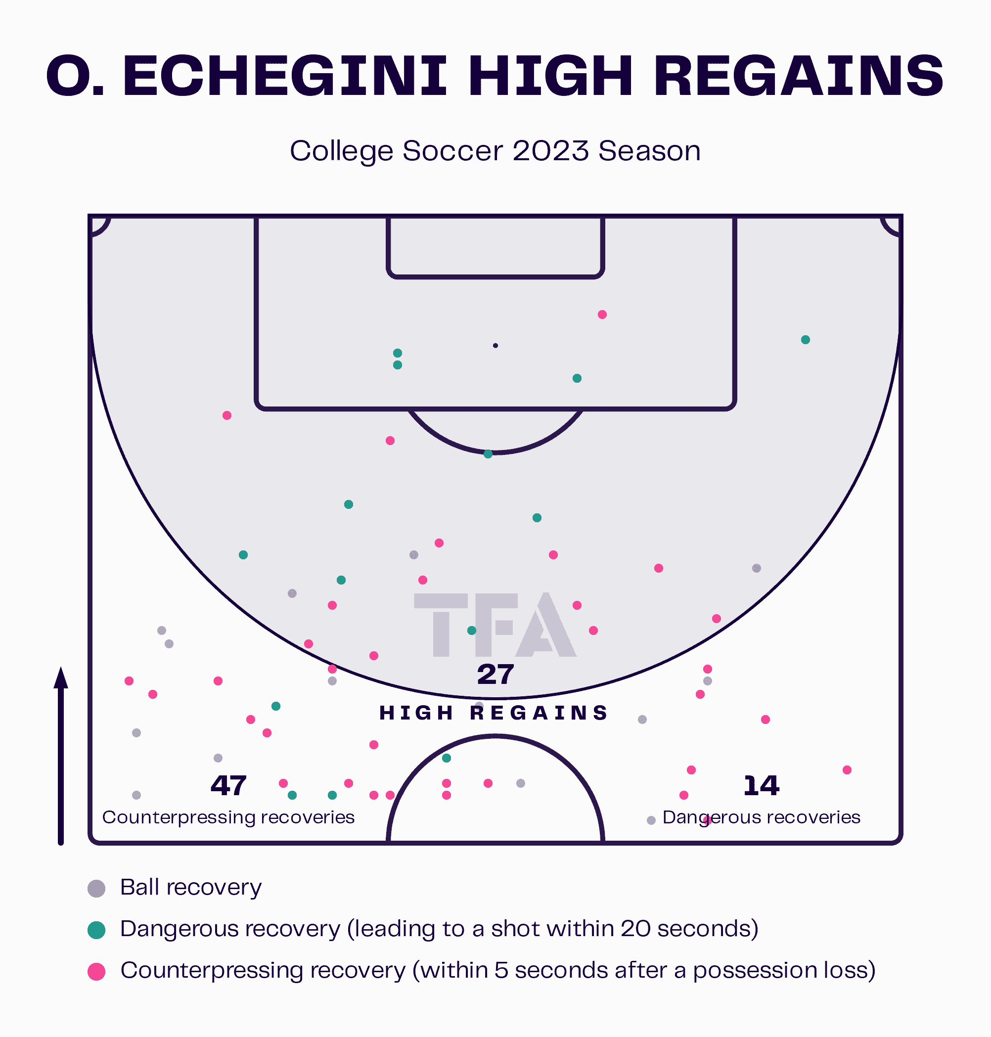 Echegini’s abilities off the ball are clear for the eye to see. However, she is by no means absent on the defensive side of the ball, although she is given less responsibility. She has demonstrated a willingness to get back and win the ball off opponents and then launch dangerous counterattacks from there. With her averaging 4.70 ball recoveries per game throughout the season with the majority of these being in the opposition half of the field, 69%. This suggests how Echegini could be utilised in a high-energy system to get involved in a high press or add some more dynamism to a midfield.