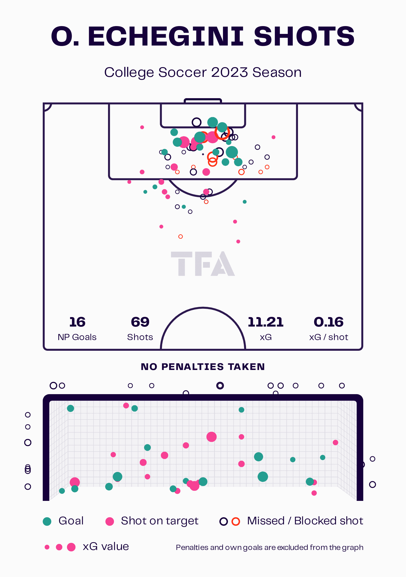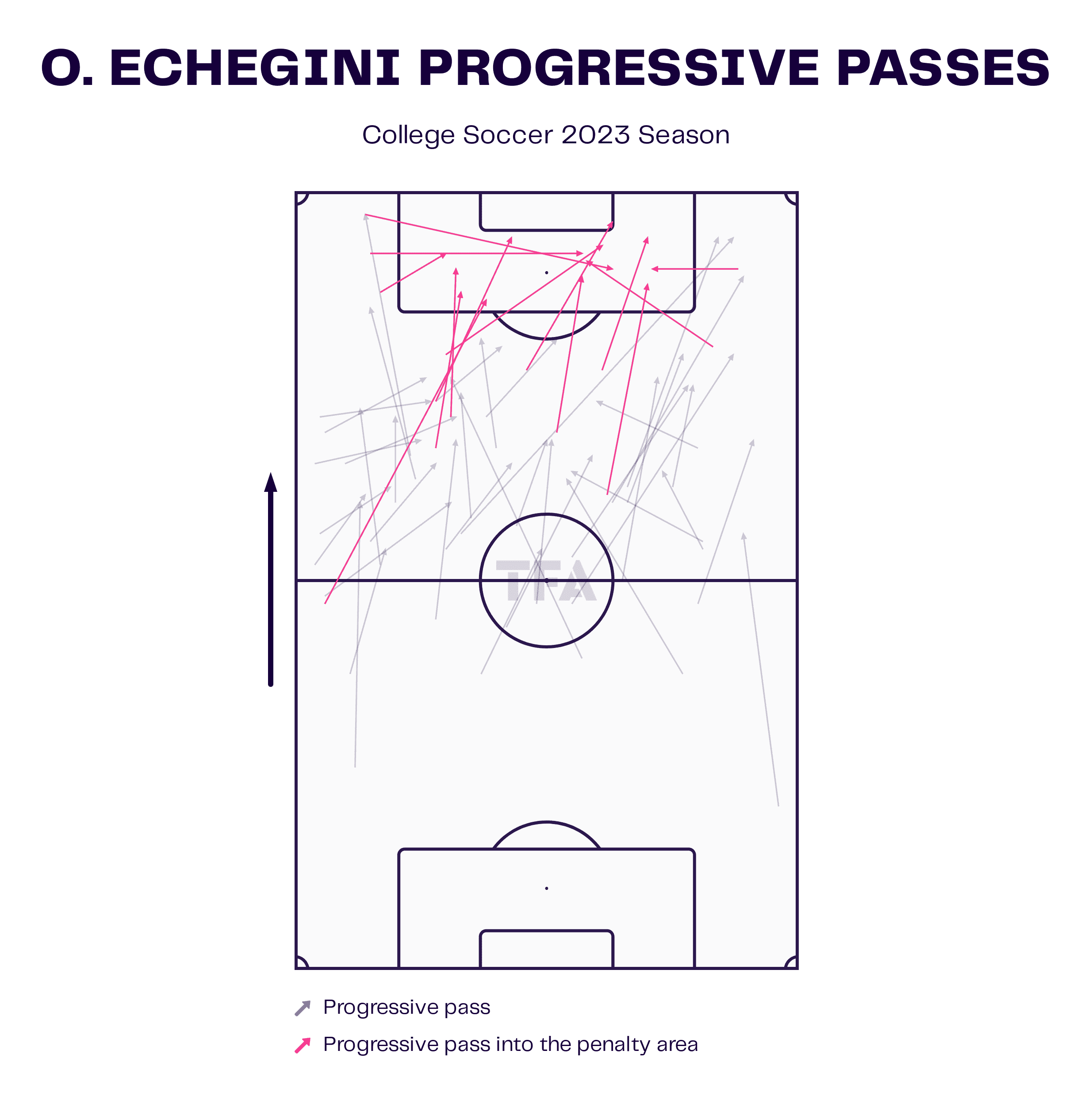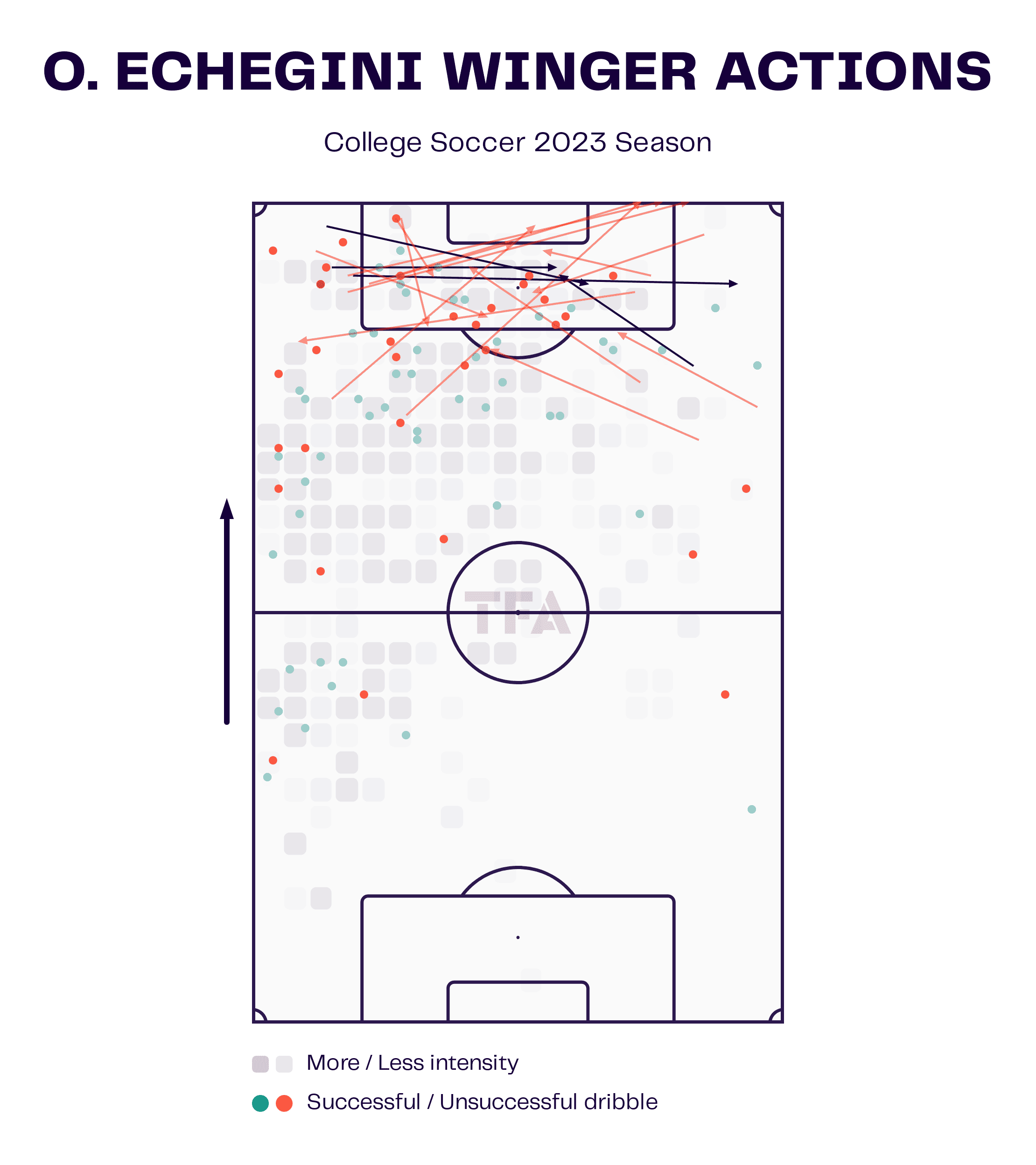 If we look at some numbers to support these observations, Echegini has an average xA per game of only 0.09 throughout the 2023 season, only achieving three assists through 23 games, completing an average of 0.2 crosses per game.