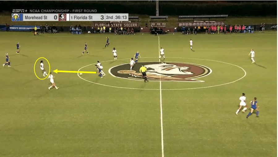 In this example, you can see her effectiveness from midfield-based positions, receiving the ball with her back to goal in the half spaces from the centre-back. She can then turn and play an aggressive penetrating through ball for her teammate to run onto.