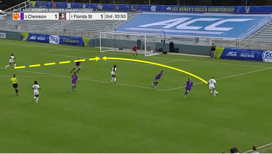 She demonstrates touch and feel in and around the box in this example. To play a well-weighted through ball for a teammate to attack the space and play a dangerous ball into the box.