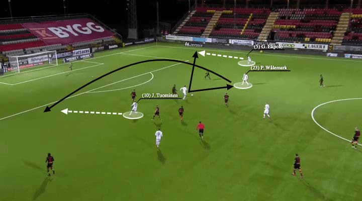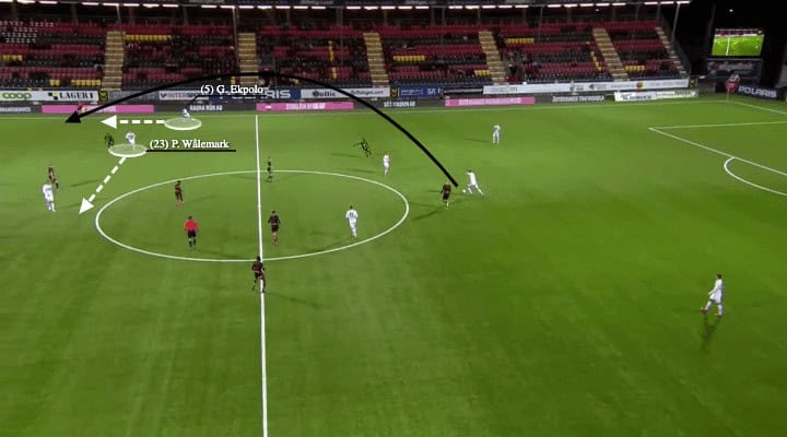 The individual movements of Wålemark helped Häcken to attack directly. Here, the central defender dribbled forward and played a long pass. Note that Wålemark, who initially oriented himself towards the left-back, intentionally went lateral infield to fix the attention of marker. Simultaneously, Ekpolo went high and wide to receive the diagonal crossfield ball, and Häcken were into the opposition half.