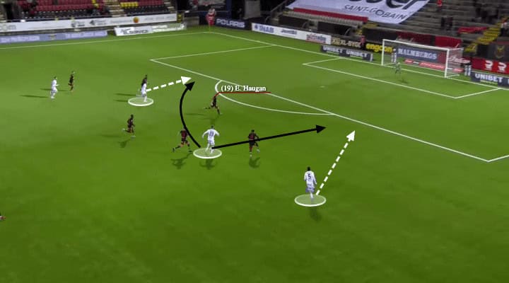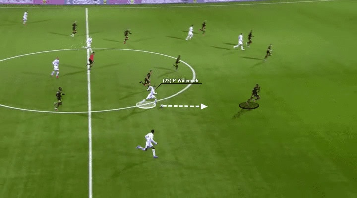 As a result, Wålemark was in the centre with a wider angle to play the ball and more options. For example, he could still release Ekpolo as Kpozo was off-balance already, that was the easiest option but the right wing-back was yet to access that space. A slightly trickier option was to slice the ball to Tuominen, who made a run through the outside space of Eirik Haugan. However, Wålemark did not release his teammates.
