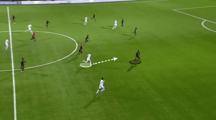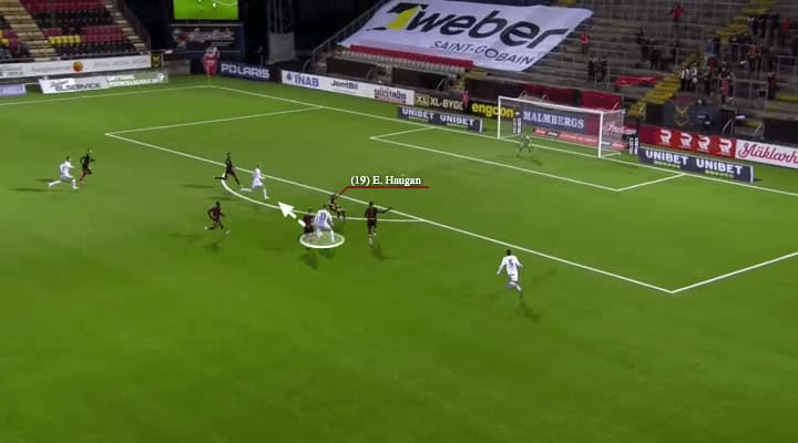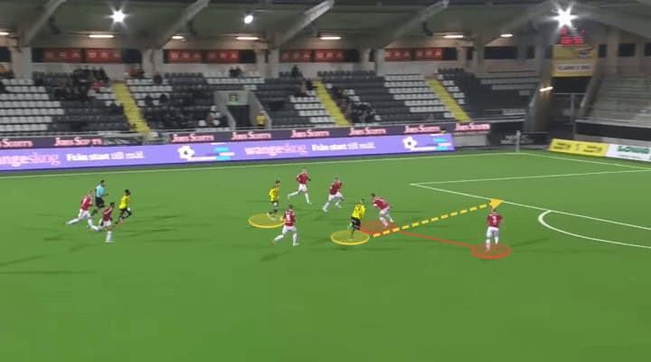 When he was closer to Kpozo, the Östersunds left-back was more facing to the flank as Ekpolo was also there. With the help of the Häcken right wing-back, the attention of Kpozo was distracted and Wålemark slightly adjusted the path of his run, by using the outside of his boot to shift the ball to the diagonal space. Kpozo was eliminated in the defence as his body angle hindered his defensive action and he could not go back to the centre in such a short time.