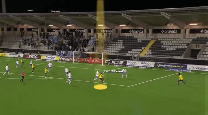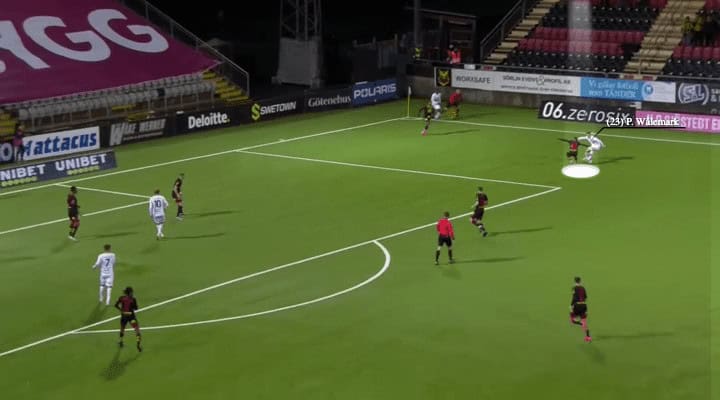 Usually, Wålemark did not run into space when his right-back had the ball but if the attack came from the other side, he would run into the gap between the left centre-back and left-back, as his starting position was usually on the inside. This was how he scored against Degerfors. In a short distance, he still had the pace to beat the defender(s) since his timing to start the run was often earlier than the defenders.