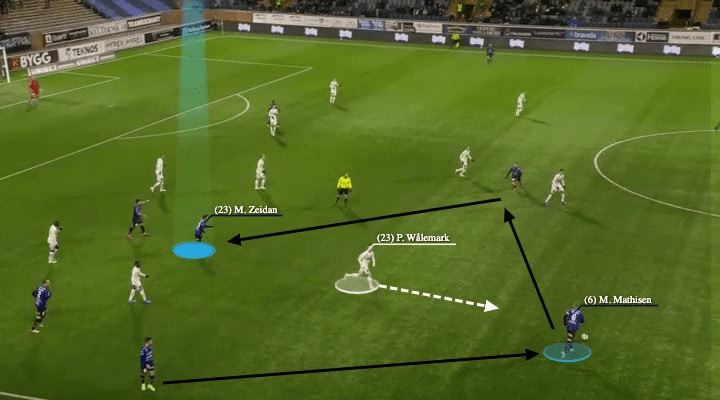 Häcken had good attacking full-backs such as Martin Olsson and Godswill Ekpolo, they often went high and wide in the attack, and the team usually constructed the attacks with four deep players. Regardless of whether the structure was a 3-1 or a 2-2 as shown above, the 10s would be staying high to operate in spaces behind the midfield. Usually, Wålemark did not drop deep to receive outside of the block, as the long passes were not his main trait. He would be patient to wait for the ball to arrive before joining the attack in advanced areas when the team proceeded.
