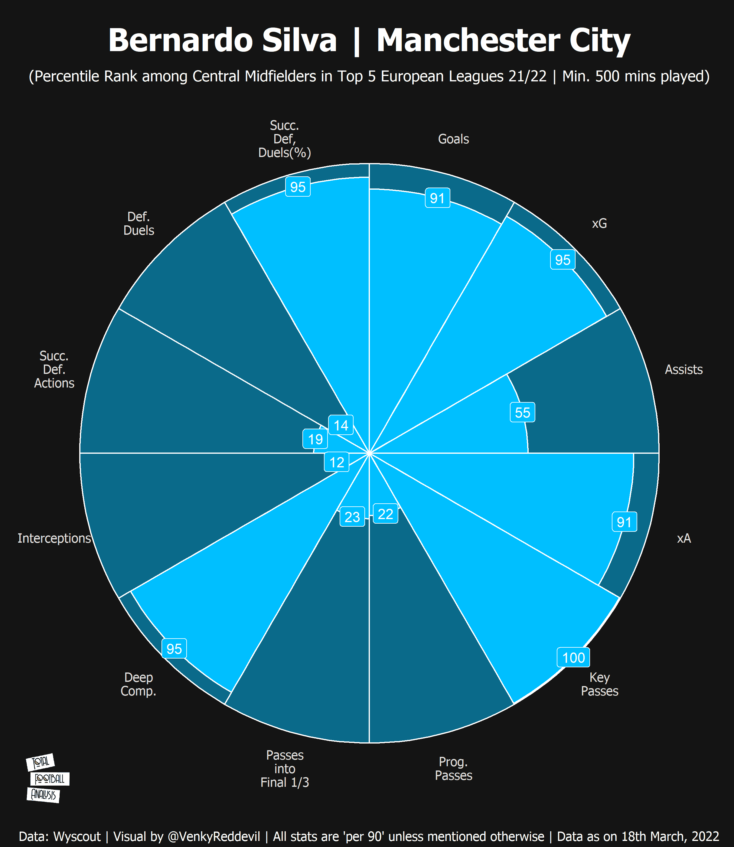 The following visualisation shows where Bernardo Silva ranks for some of the key metrics when compared with central midfielders from Europe’s top five leagues.
