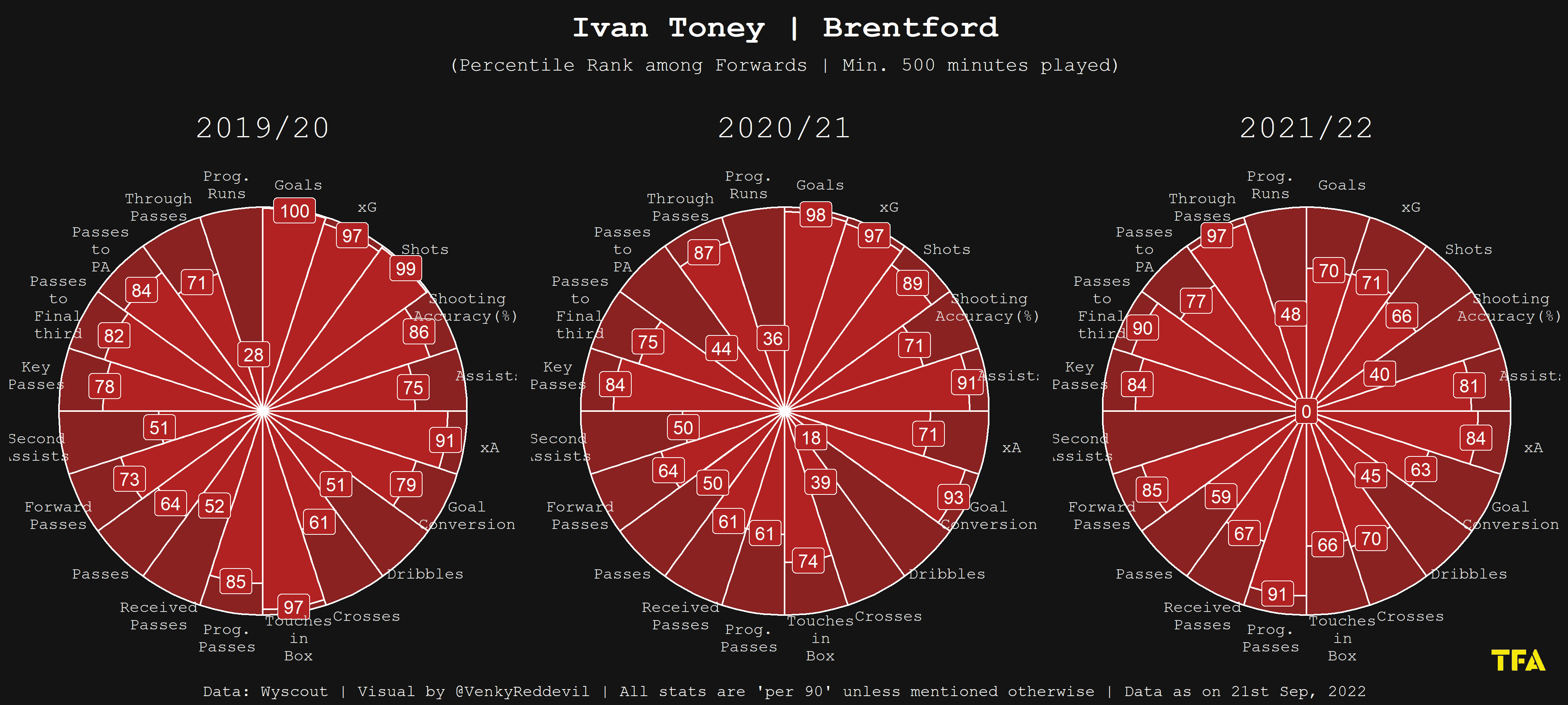 If there is one thing that Toney’s rise from League Two to the Premier League shows, it is that Ivan Toney has become one of the most complete strikers in the world, as the above visual indicates.